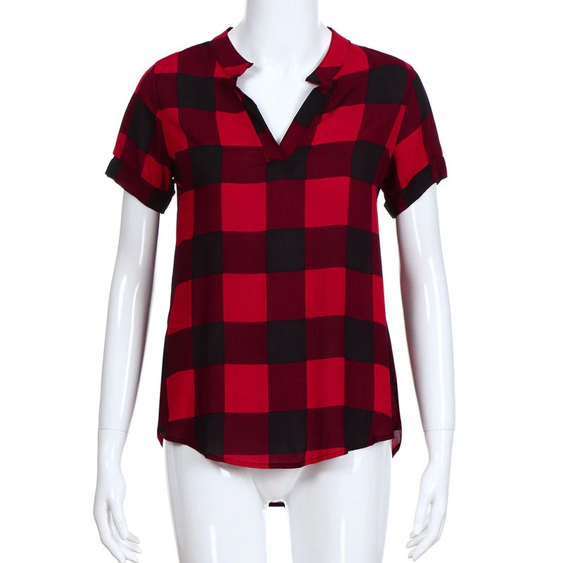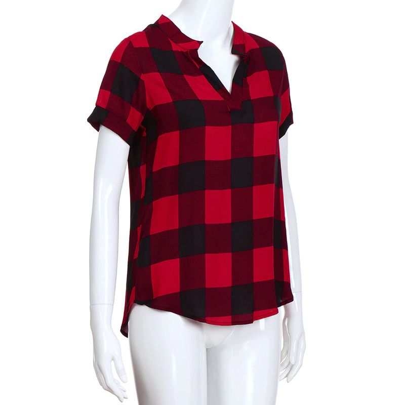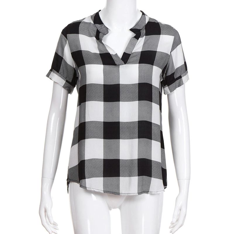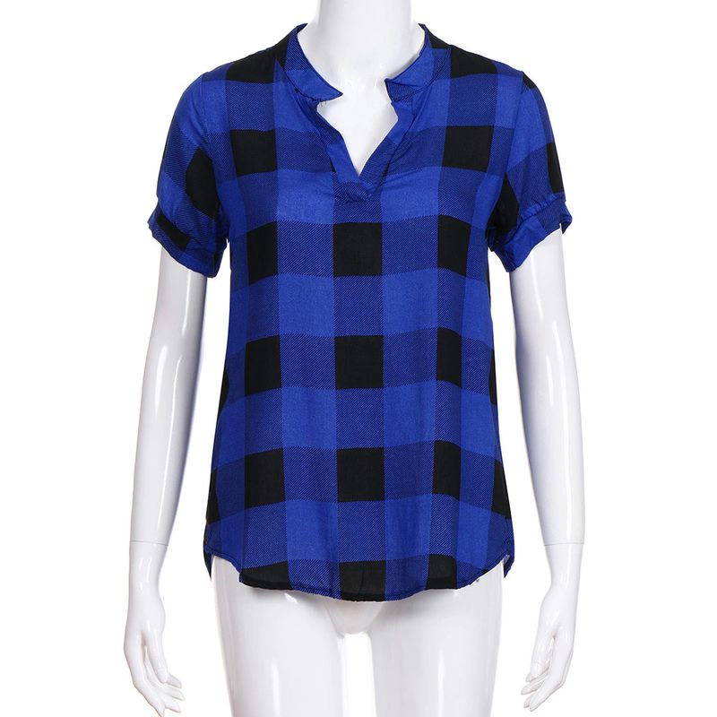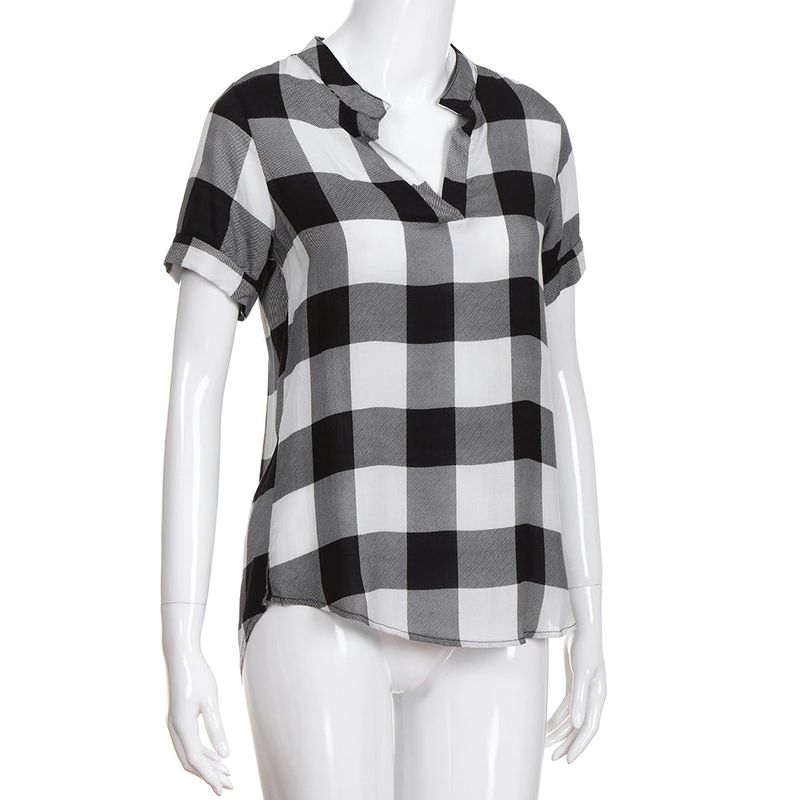 여성 캐주얼 체크 무늬 프린트 반소매 v넥 불규칙한 밑단 블라우스 티셔츠 탑