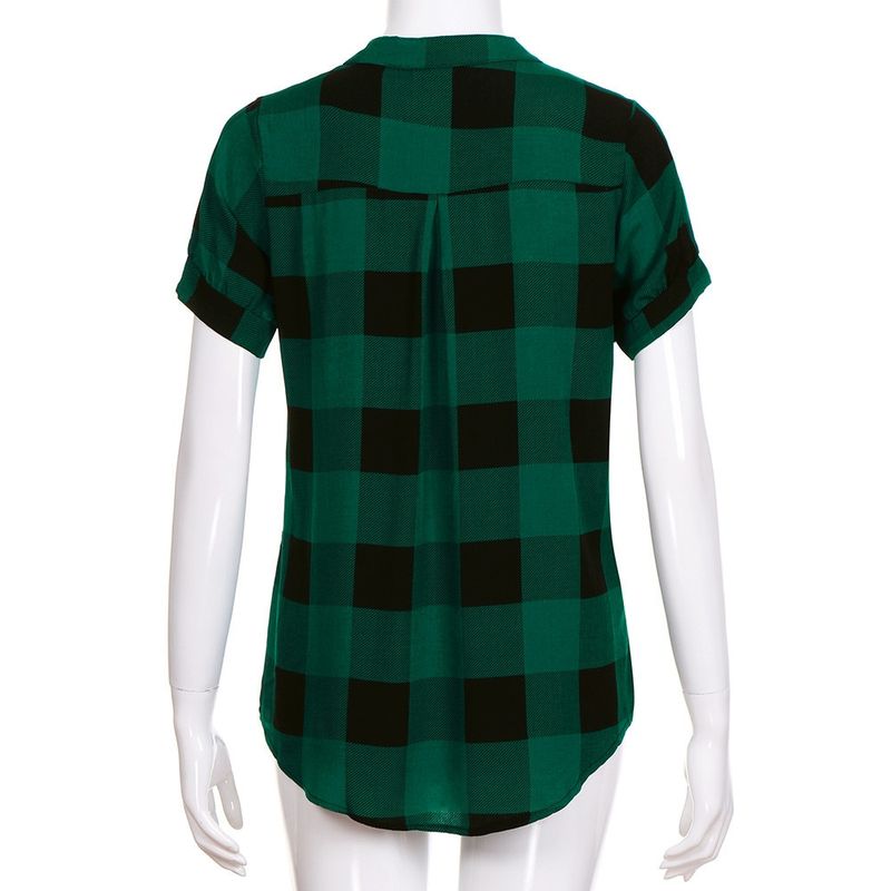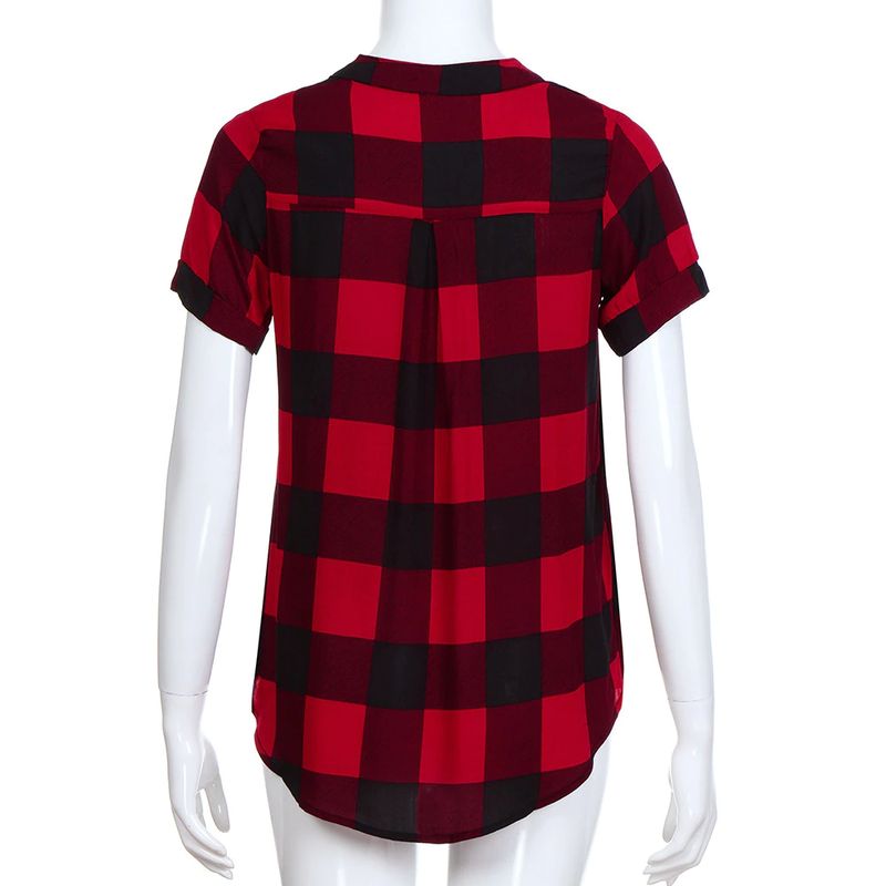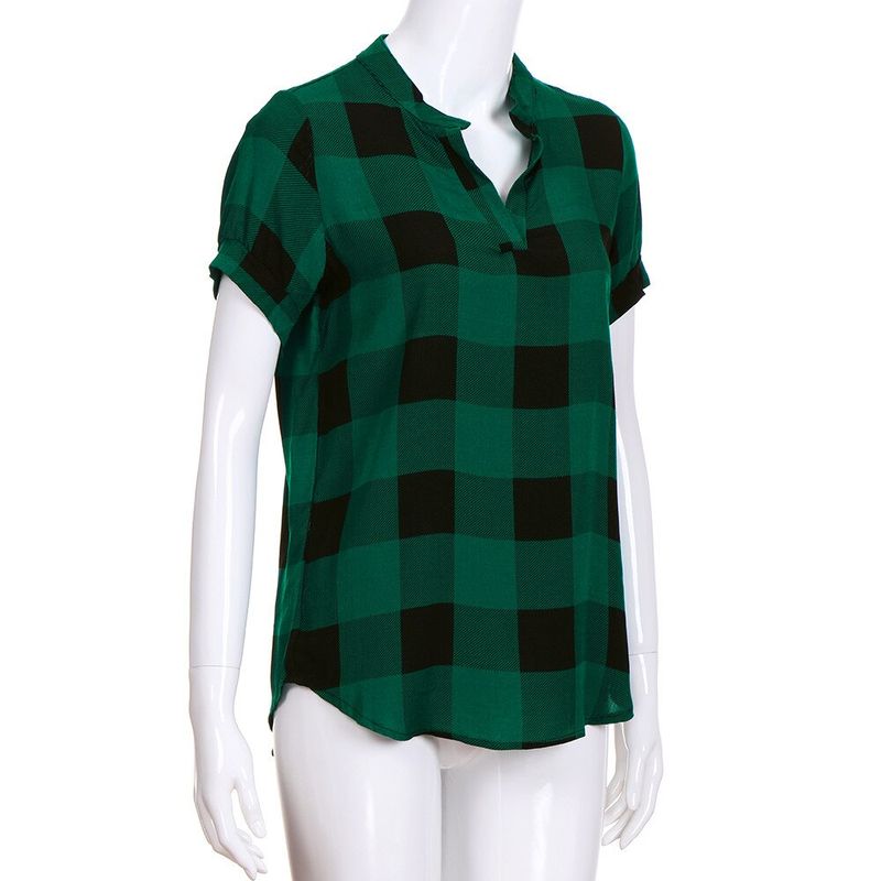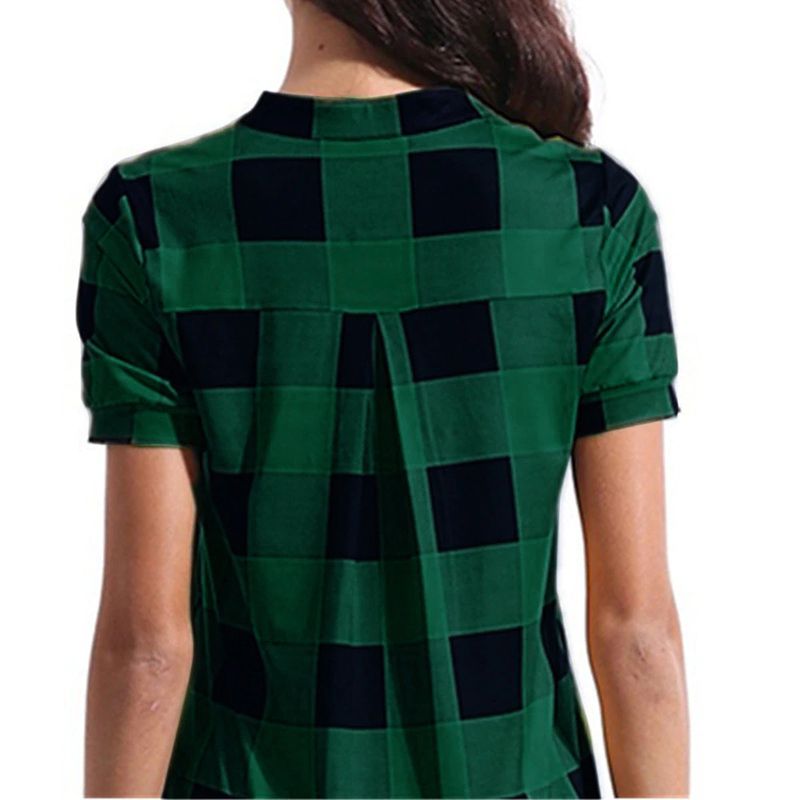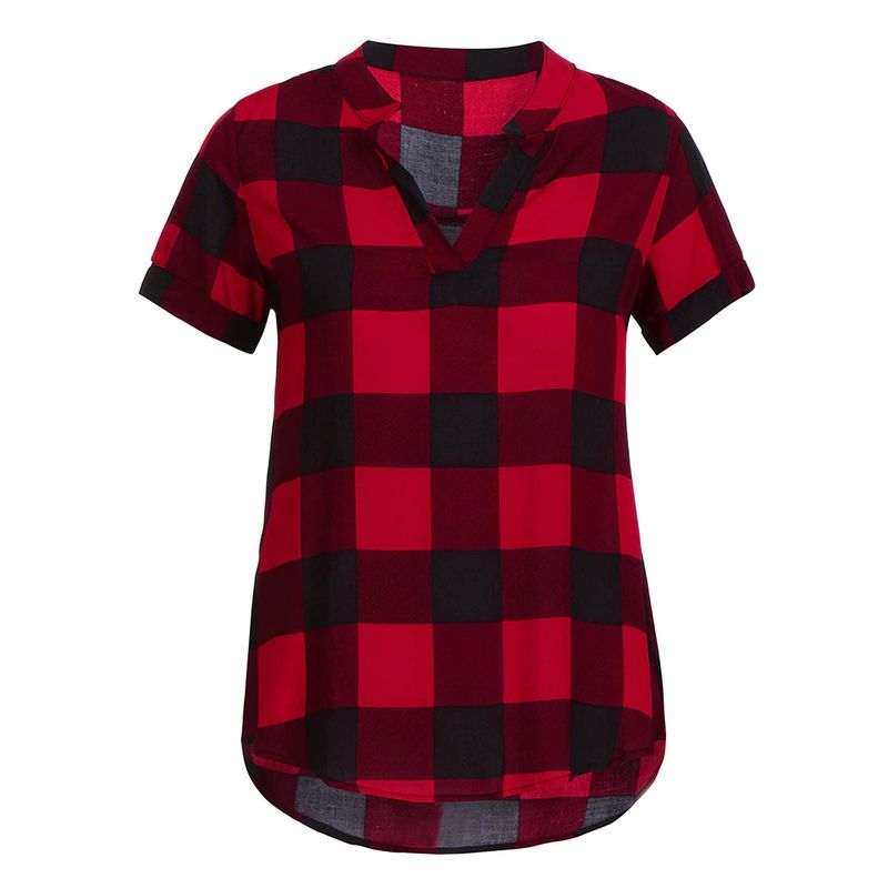 여성 캐주얼 체크 무늬 프린트 반소매 v넥 불규칙한 밑단 블라우스 티셔츠 탑