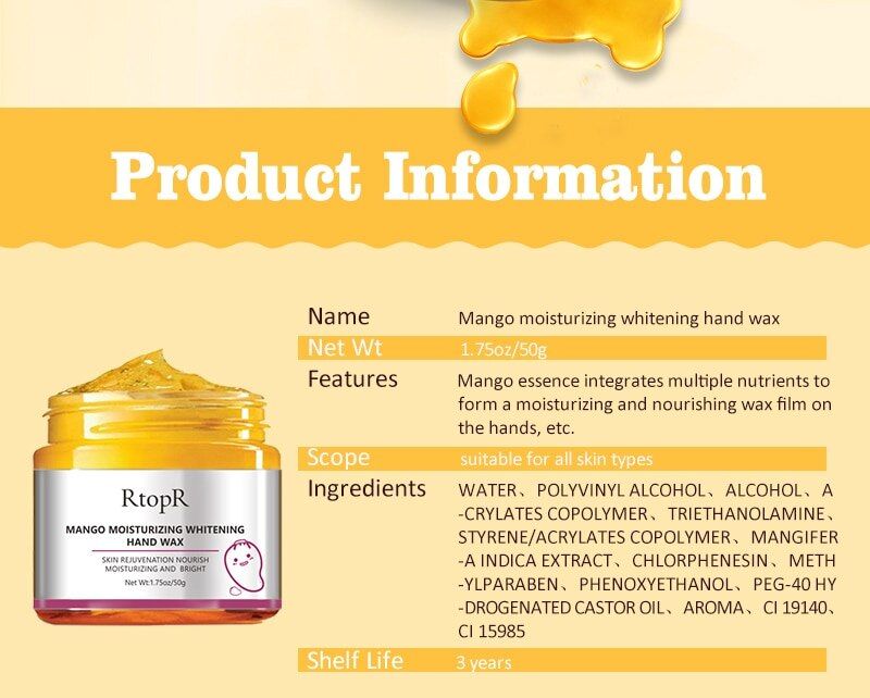 RtopR 망고 핸드 마스크 핸드 왁스 화이트닝 모이스춰 라이징 리페어 엑스 폴리 에이 팅 캘러스 안티 에이징 핸드 크림 50g