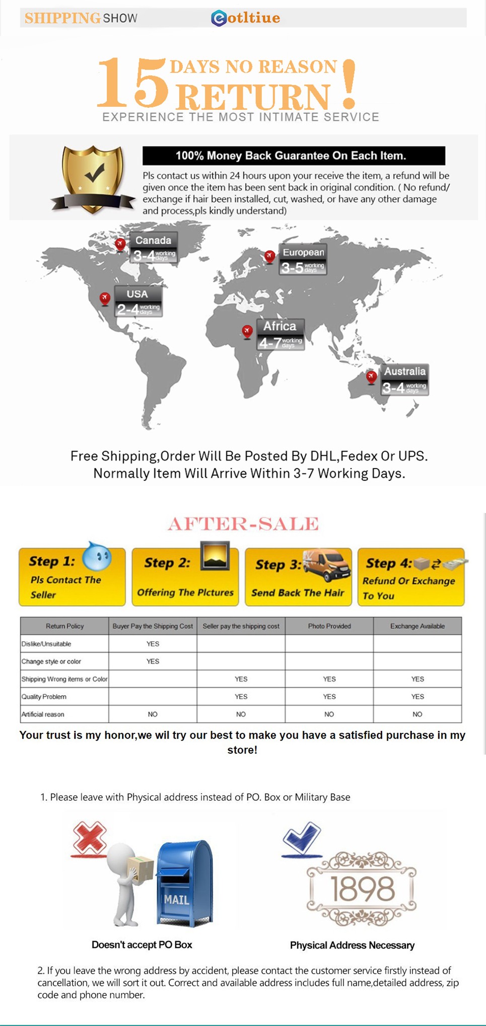 당신의 순서가 “자유로운 반환” 서비스로 이지 않는 경우에, 그것의 본래 국가에 있는 머리를 지키고 제 시간에 저희에게 연락하십시오. 우리는 당신에게 반환 선박 주소를 보낼 것입니다. 반환 & 환불을 위한 구매자가, 운송비 지불한 구매자이기 때문에 질 문제를 제외하고. 우리는 당신의 순서를 위한 가공 시간을 확장하고 포장이 도착한 후에, 우리는 당신의 돈 전부를 환불할 것입니다.