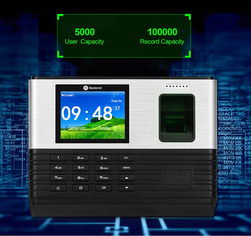 이 지문 타임 레코더를 사용하면 직원이 지문, RFID 카드 및 비밀번호로 체크인 할 수 있습니다. 5000 사용자 용량 지원, 5000 지문, 5000 암호, 5000pcs RFID 카드, 10관리자, 100000 레코드 용량