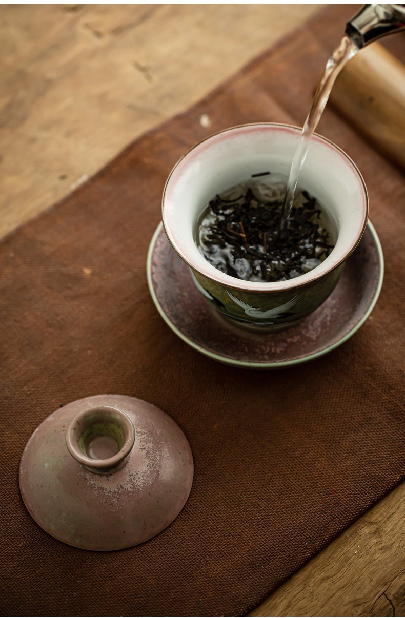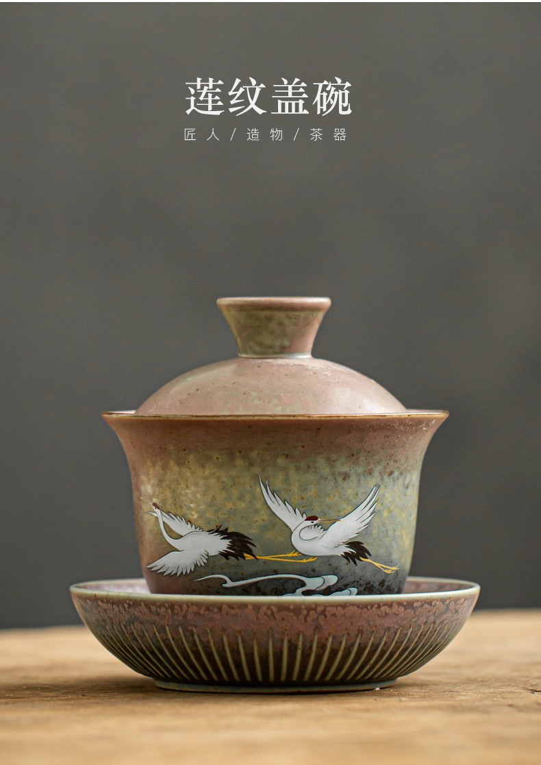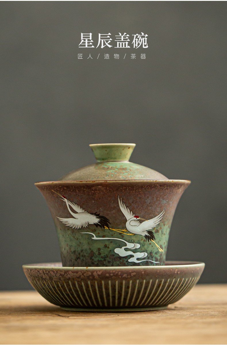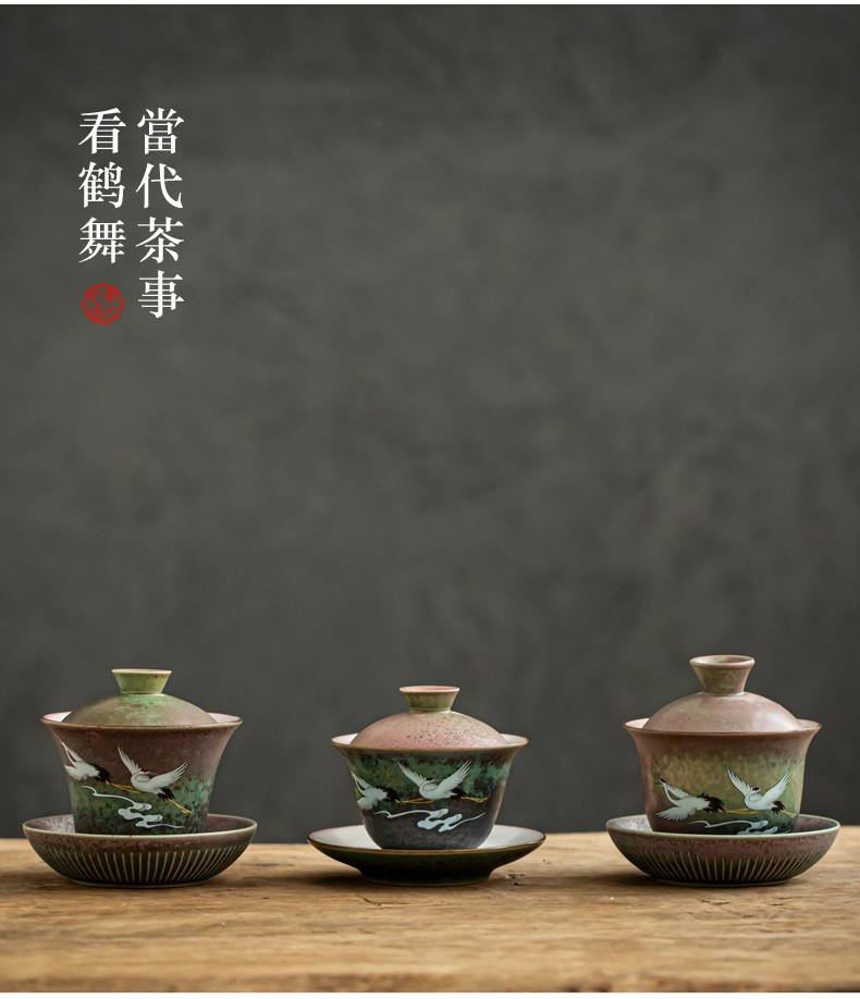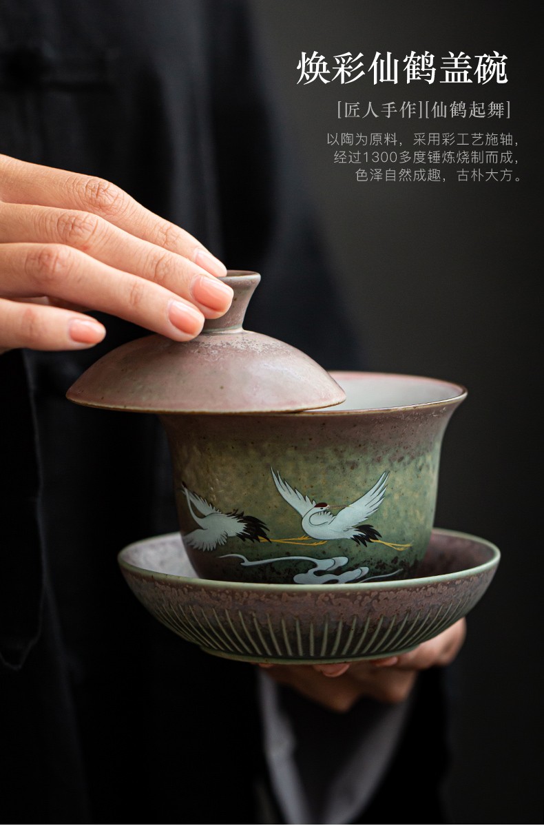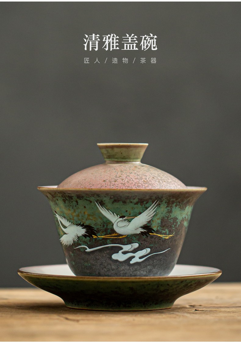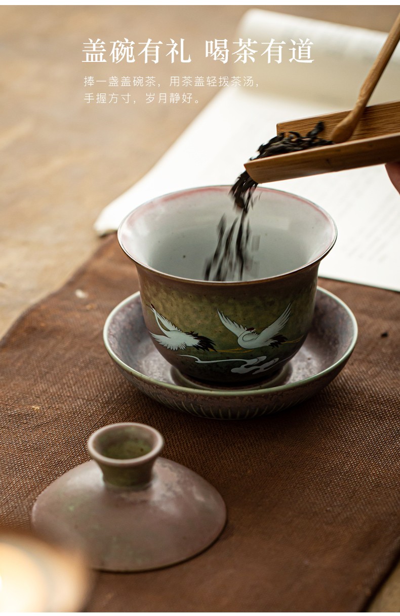 Cuenco De Cerámica Con Tapa Para Té, Cuenco Retro Grande Antiquemaduras Con Cubierta De Grúa Brillante Pintada A Mano, Sancai Gaiwan