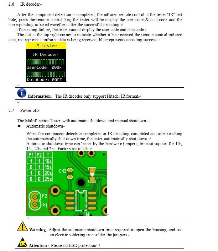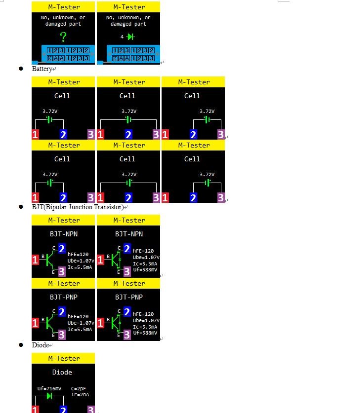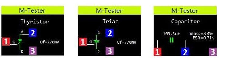LCR-T7 / LCR-TC1: شاشة ملونة/رقاقة M644 ، وظيفتين هي نفسها! T7 أسرع قليلا! شاشة TC1 أكبر قليلاً وهي كلها مدعوم من بطاريات ليثيوم. بالإضافة إلى قياس المقاومة ، السعة ، الحث ، الثنائيات ، الترانزستورات MOS ، الثايرستور ، فإنه يمكن أيضا قياس منظمات الجهد الكهربي إضافية ، فك الأشعة تحت الحمراء (تقتصر على تنسيق هيتاشي)