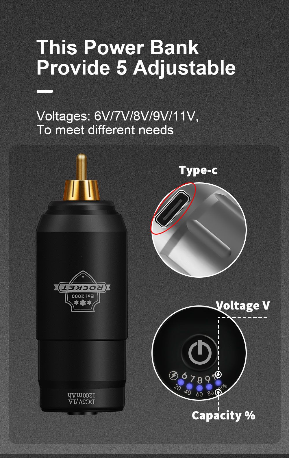 1. Materiale: In Lega di Alluminio 2. Tensione di uscita: 6 7 8 9 11v 3. Tensione in ingresso: DC5V/1A 4. Modalità di carica: tipo-c carica rapida 5. Connessione: RCA 6. Capacità della batteria: 1200mAh