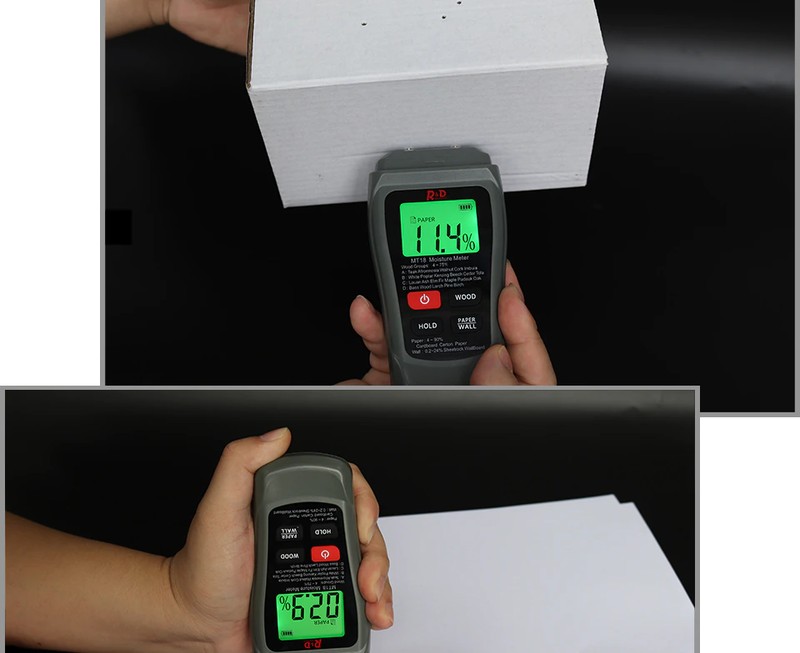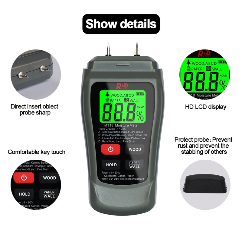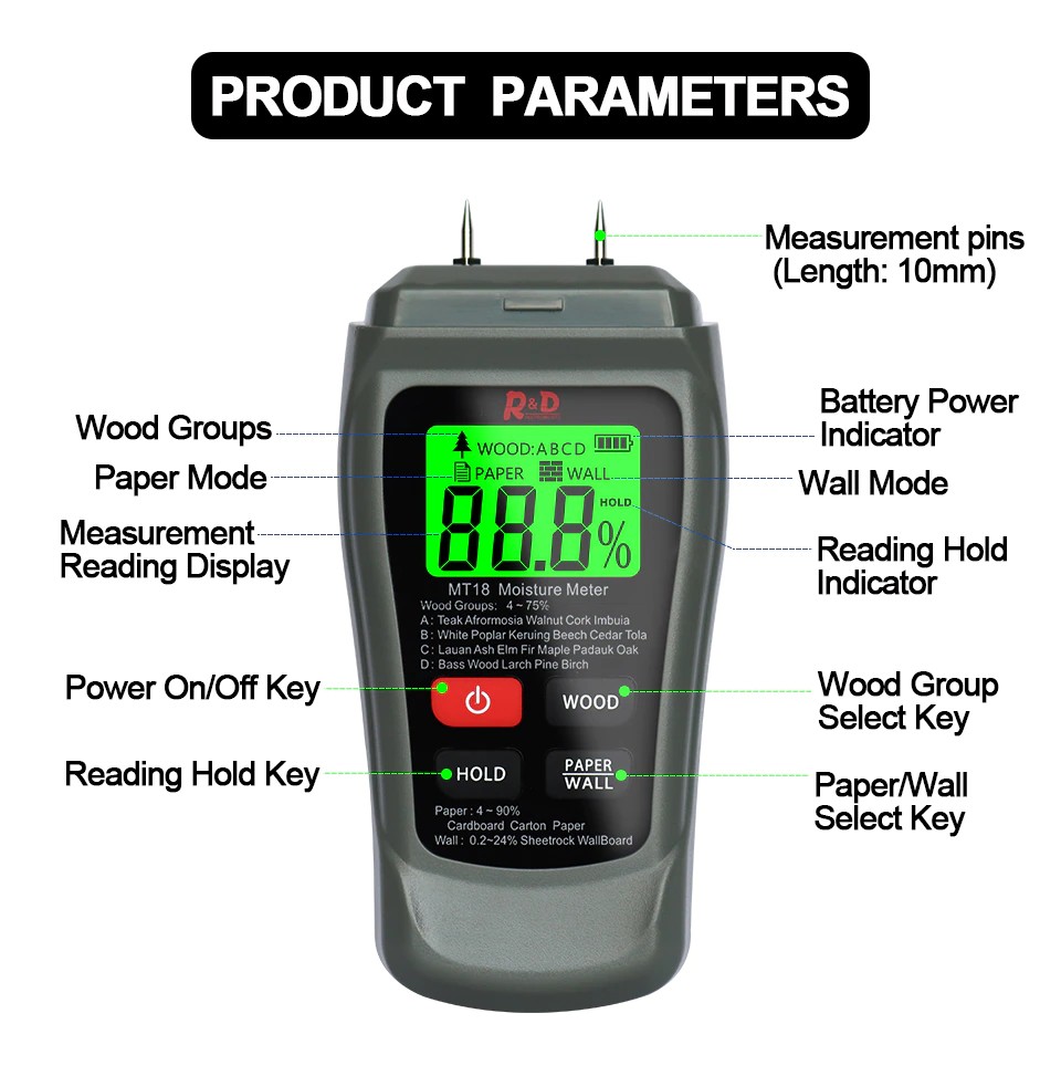 Enstrüman, her türlü ağaç türünde kullanıcının doğru nem ölçümlerini almasını sağlayan ABCD ahşap ölçeklerine sahiptir. Karton, karton ve kağıt nemini Test etmek için kağıt modunu seçebilirsiniz. Ve sheetrock, wallboard veya diğer yapı malzemelerinin nemini test etmek için duvar modunu seçebilirsiniz.