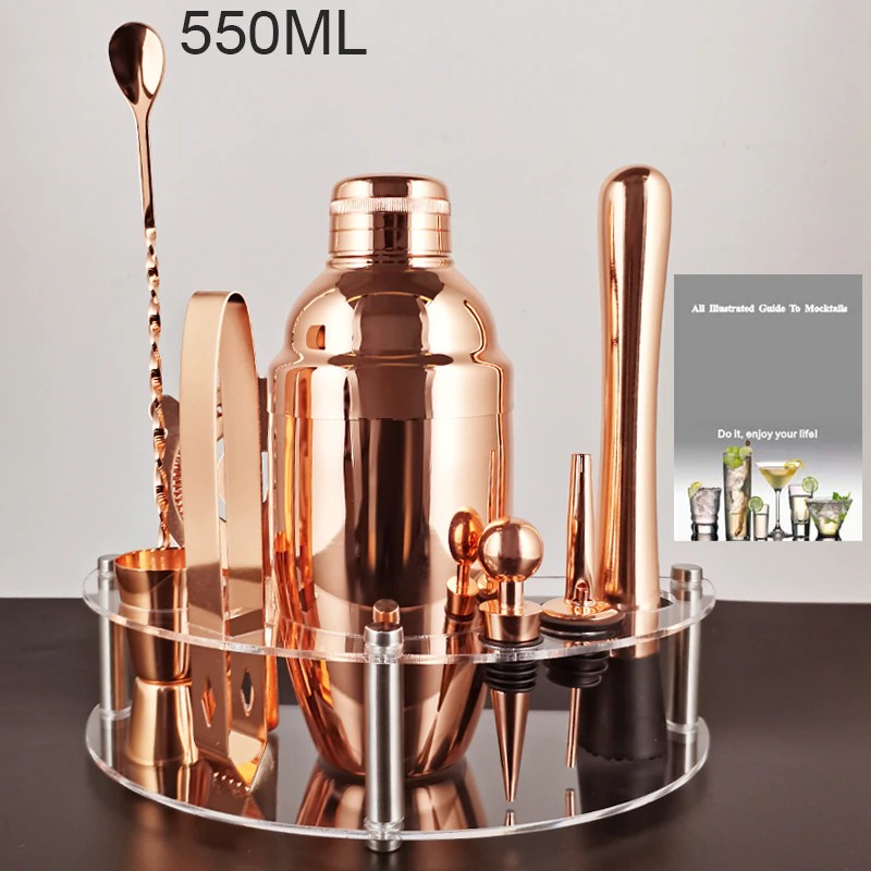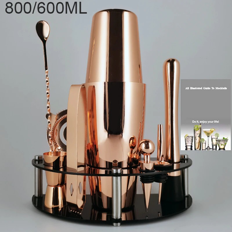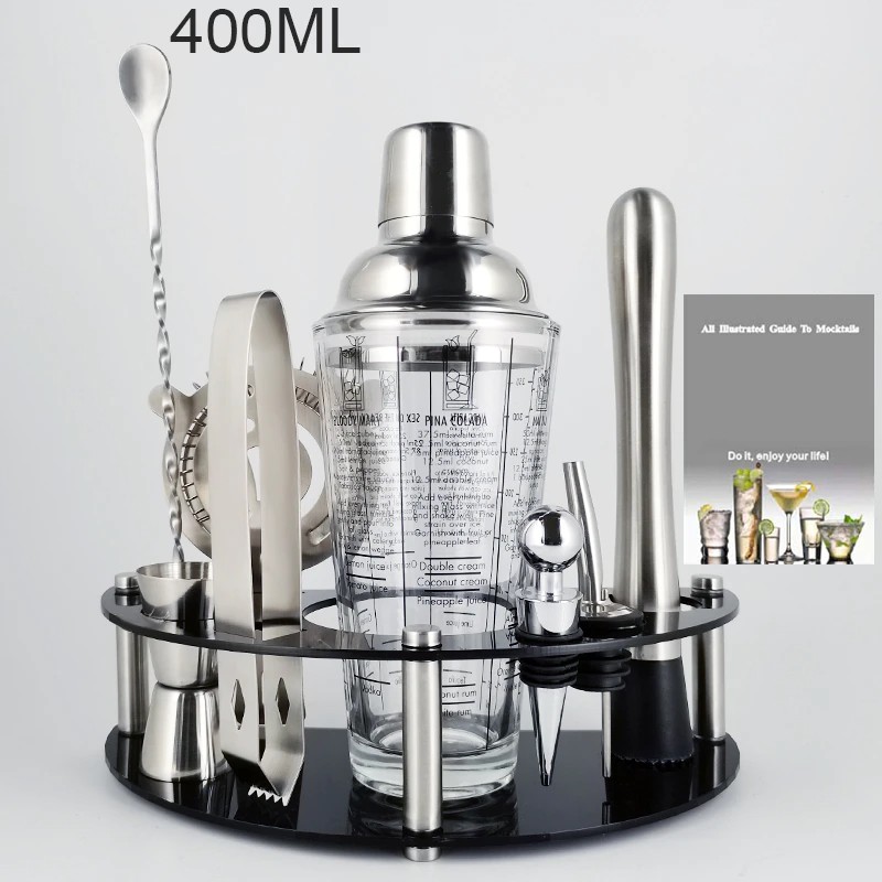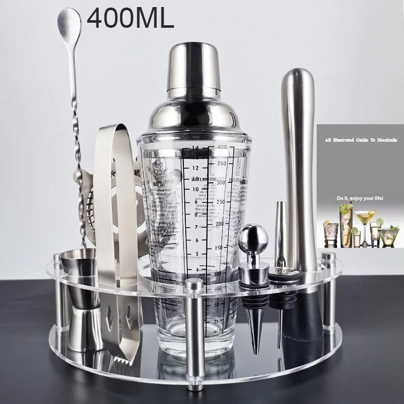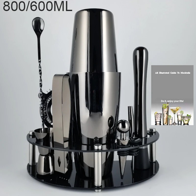 1 x Shaker (Zilver/Zwart/Rose Goud/Glas + Zilver). 1 x Muddler, 1 x Zeef, 1 x Ijs Tang, 1 x Lepel & Vork, 1 x Schenker, 1x15/30ml dubbelzijdig jigger, 1 x Cork,1 x Drink Recept, 1x Acryl Stand (Zwart/Transparant).