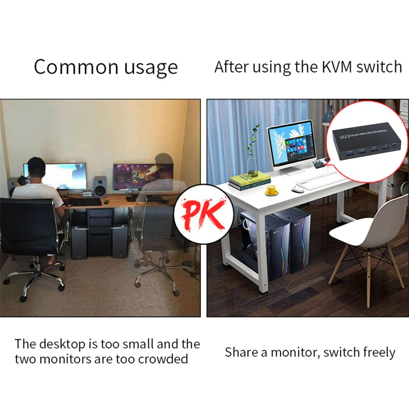 De KVM box is ontworpen met twee HDMI-compatibel input poorten en een uitgang poorten, die effectief kan verbinden twee computer gastheer met een monitor. De twee computer host kan ook gebruik hetzelfde toetsenbord en muis set, maken uw bureau netjes en bezetten minder installatie ruimte.