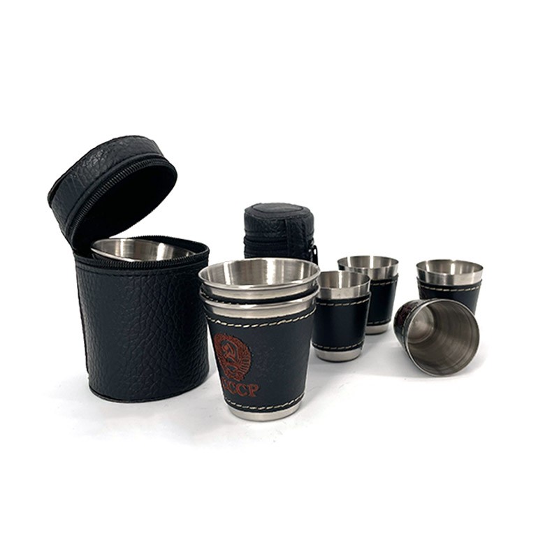 4 Stks/Partij 30/70Ml Outdoor Camping Servies Travel Cups Set Picknick Benodigdheden Rvs Wijn Bier Cup Whisky Mokken Pu Leer