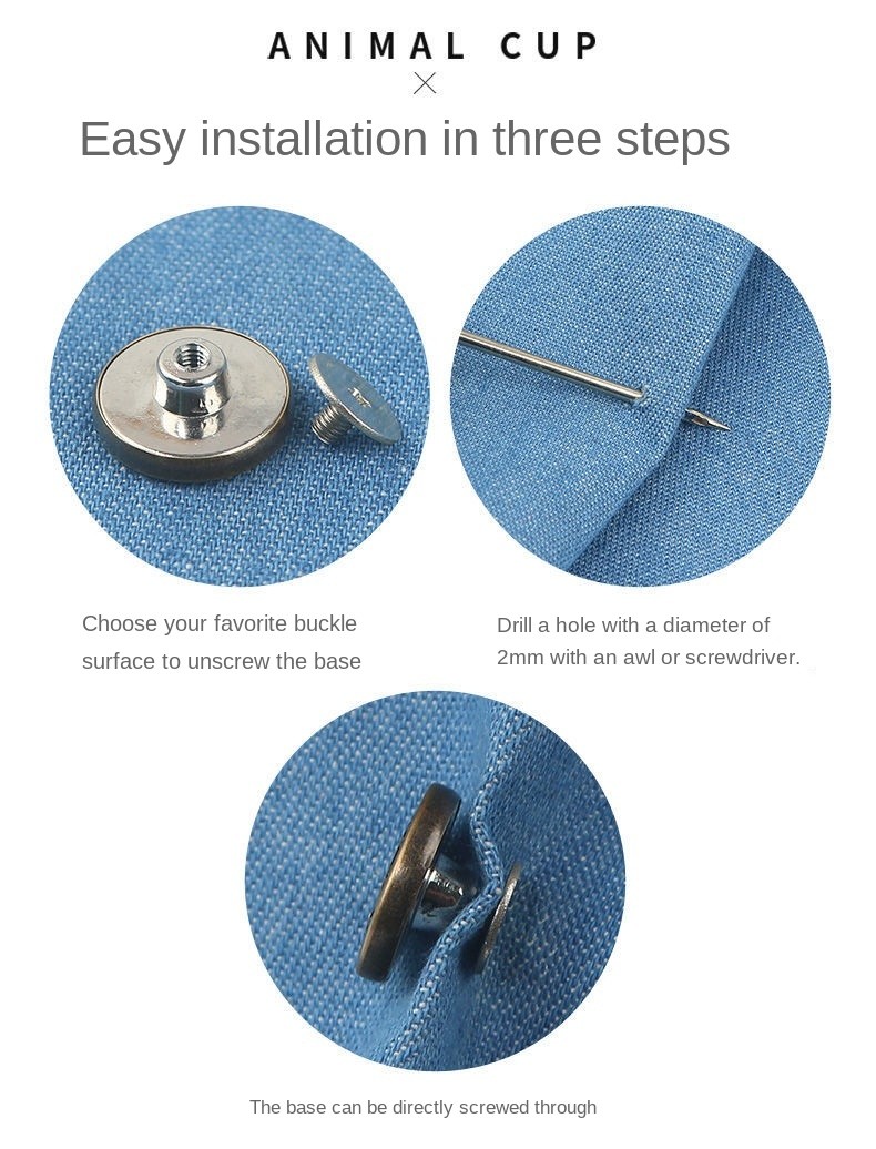 Verwijderbare knoppen zijn gemaakt van hoge-kwaliteit metalen, niet roestig, sterk en duurzaam en niet gemakkelijk te krijgen erosie. versterkte klinknagels, decoratieve patroon op oppervlak en de metalen basis is dikker, zijn niet gemakkelijk te buigen en schade onder vinger druk.