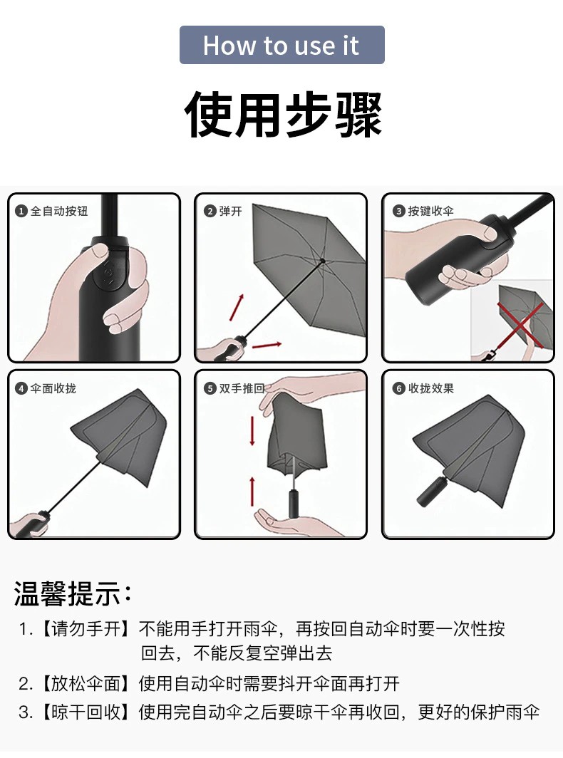 Warm tip: niet open het door hand. Gebruik de full-automatische knop om open het, en gebruik de knop te sluiten de paraplu. Na de paraplu oppervlak is gesloten, push terug met beide handen. Wanneer u het opent, laat de paraplu oppervlak schudden volledig. Na gebruik, droog het alvorens terug de paraplu, die beter beschermen de paraplu