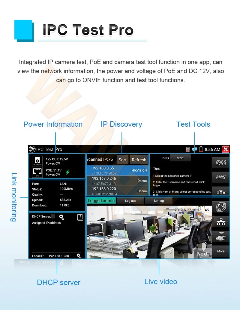 ● IPC test pro, auto scan alle netwerk segmenten IP, auto open PoE power en display de power. Input gebruikersnaam en wachtwoord, kan scan camera afbeelding, kan batch activeren HIKVISION en Dahua camera's. Sprong naar ONVIF interface en test tools.