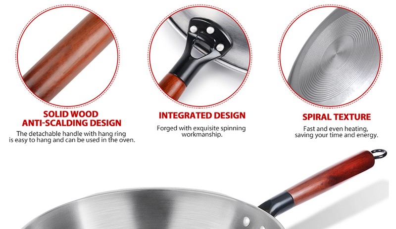●【Include accessories】-Accessoires omvatten wok * 1 houten handvat * 1 inch lange schroef * 1. Het handvat is gemaakt van hout en zal niet hot tijdens gebruik.