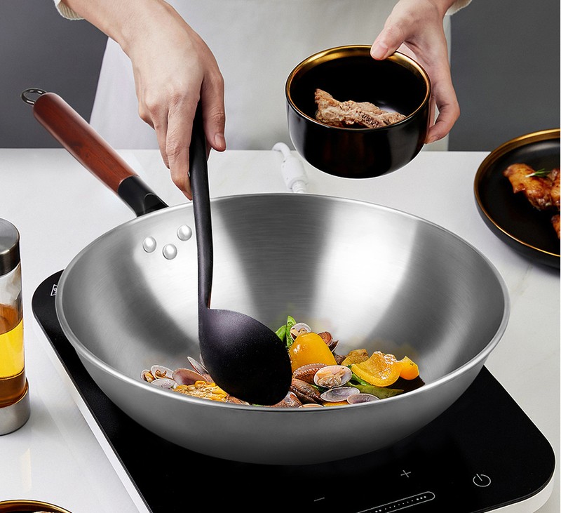 ●【Size】The grootte van deze wok is 30cm, 32cm, en 34cm. Diameter van de bodem van de pot-Na een uitgebreide test, het kan worden gebruikt op elektrische kachels, inductie fornuizen, gas kachels en andere warmtebronnen.