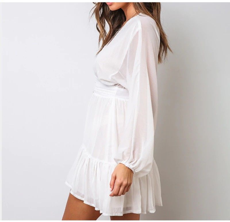 Dicloud Sexy duik V-Hals Vrouwen Zomer Jurk Wit Kant Lange Mouwen Mini Wedding Party Jurk Bijenkorf Elegante Kleding Nieuwste