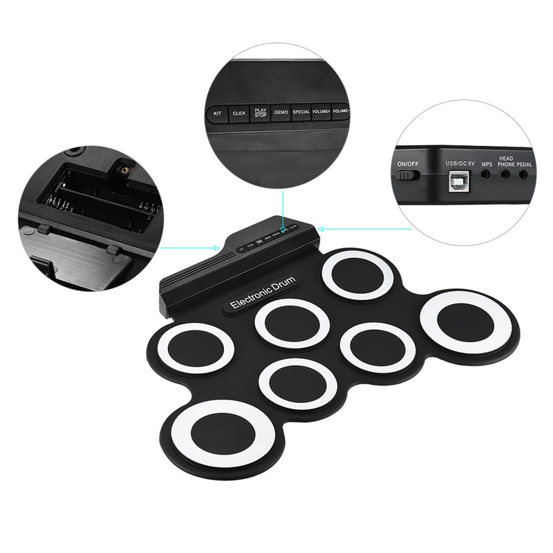 Met 7 silicon drum pads inclusief Tom(3)/ Snare/ Hi-Hat/ Crash/Rit, maken uitstekende geluiden en simuleren real kloppend effect; SNARE en HI-HAT posities kan worden uitgewisseld volgens de gewoonte van speler door op SPECIALE knop.