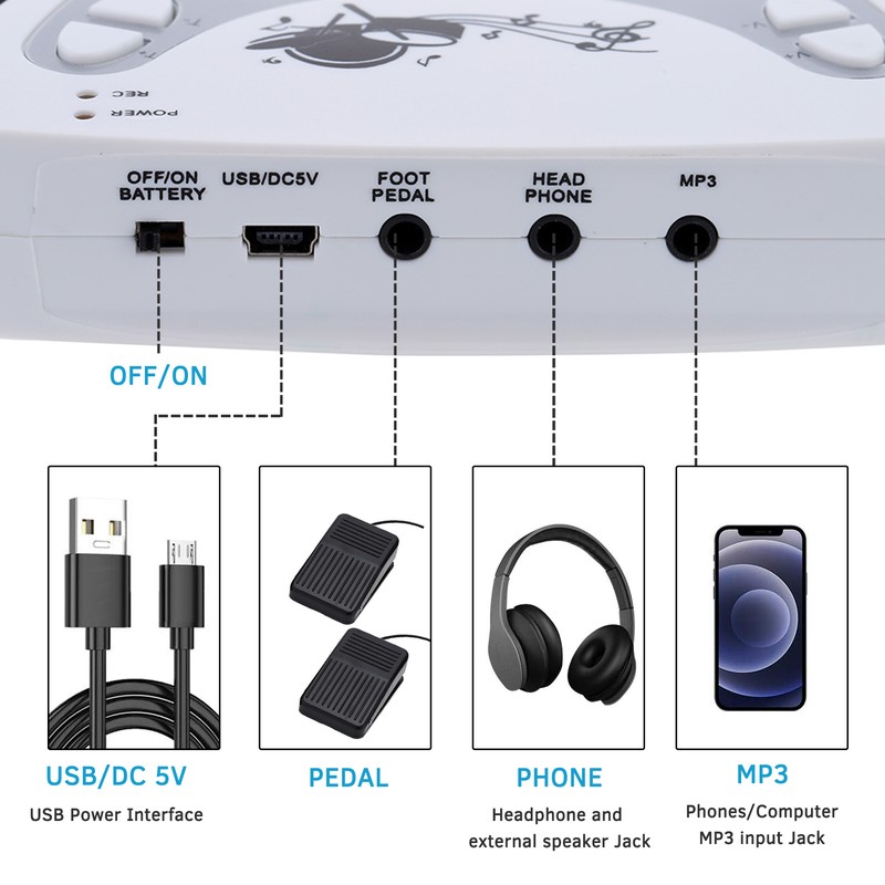 Ingebouwde 5 drum set tonen en 8 demo songs voor gemakkelijker praktijk; met MP3 input voor aansluiten MP3/ smartphone/ tablet te spelen begeleidende muziek.