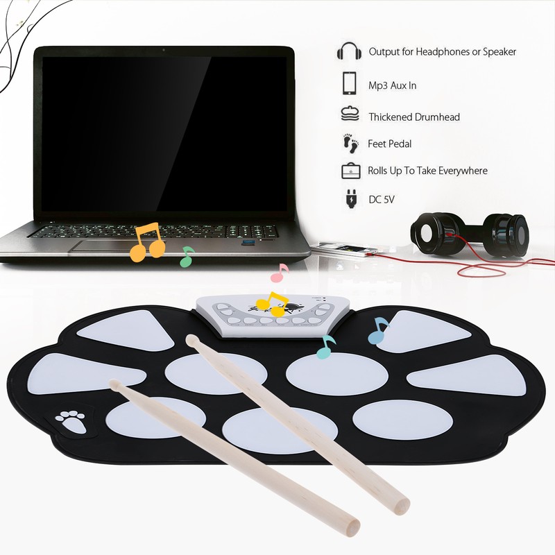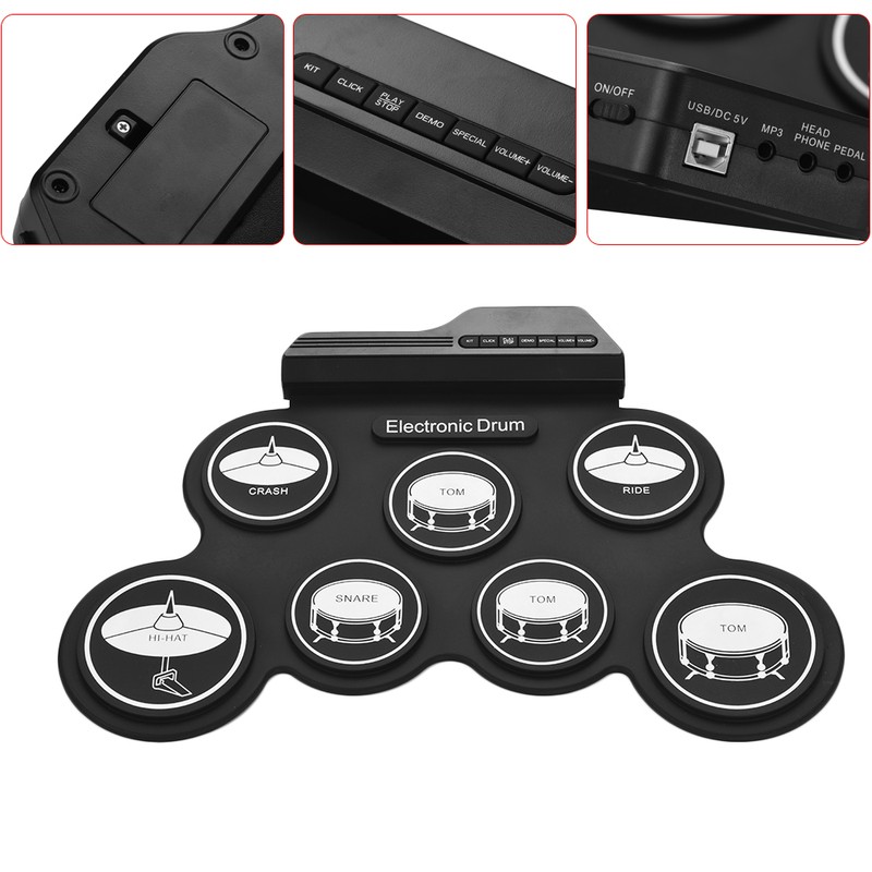 Met 7 silicon drum pads inclusief Tom(3)/ Snare/ Hi-Hat/ Crash/Rit, maken uitstekende geluiden en simuleren real kloppend effect; SNARE en HI-HAT posities kan worden uitgewisseld volgens de gewoonte van speler door op SPECIALE knop.