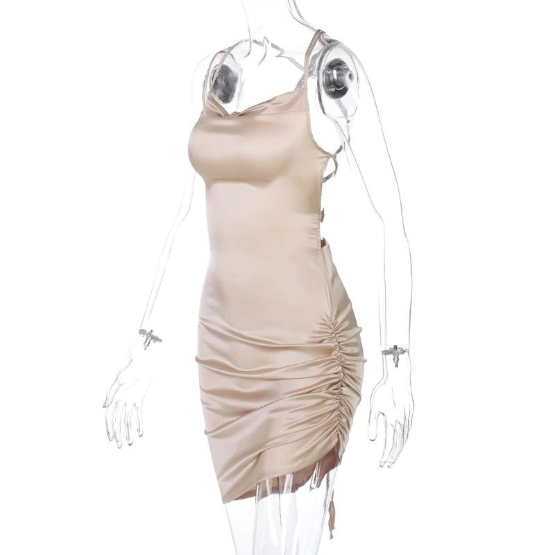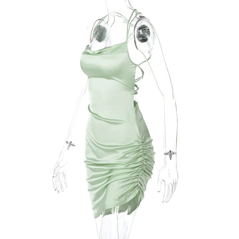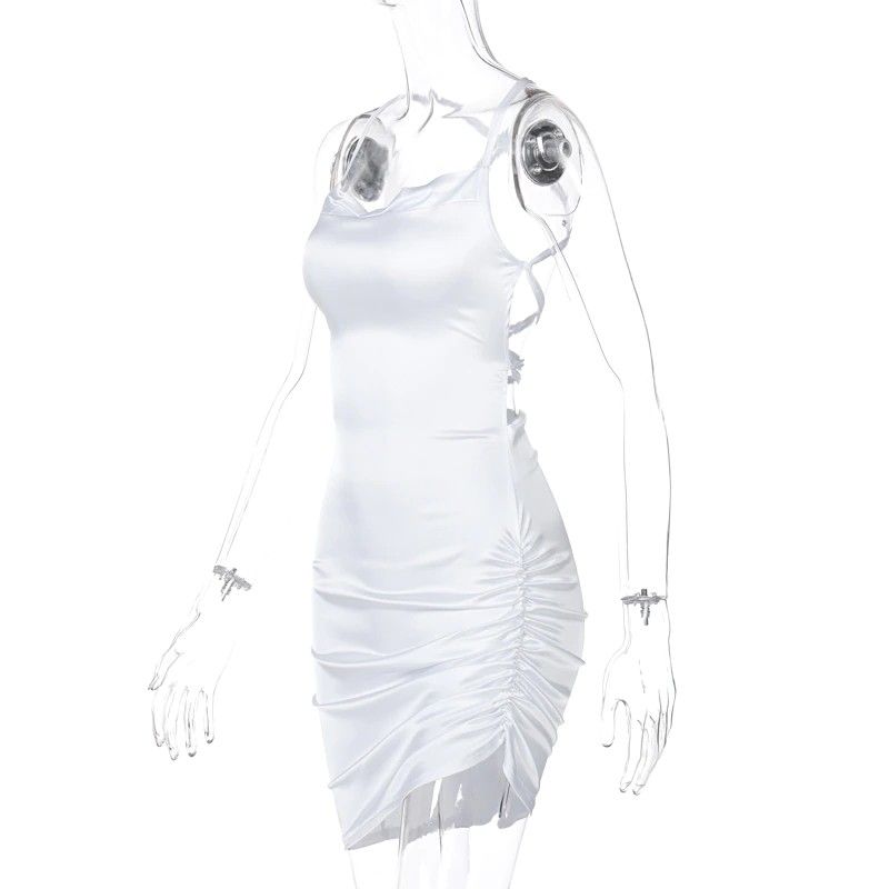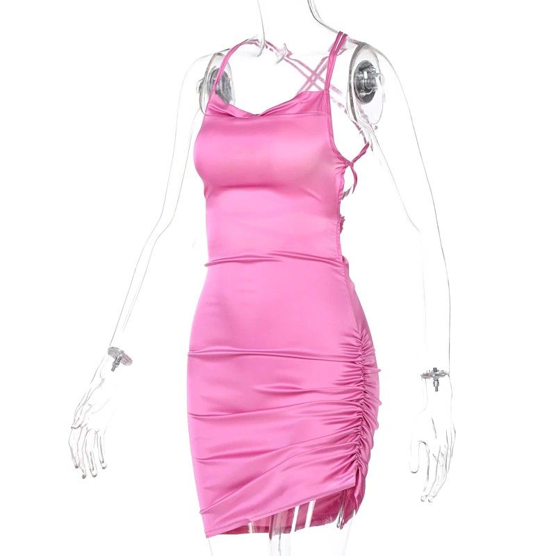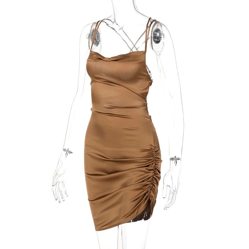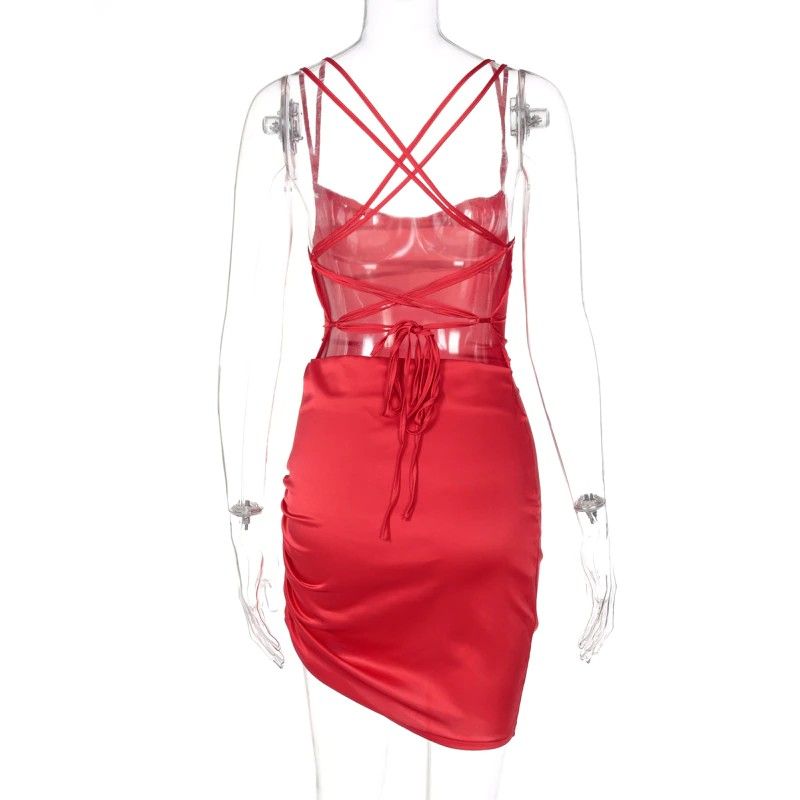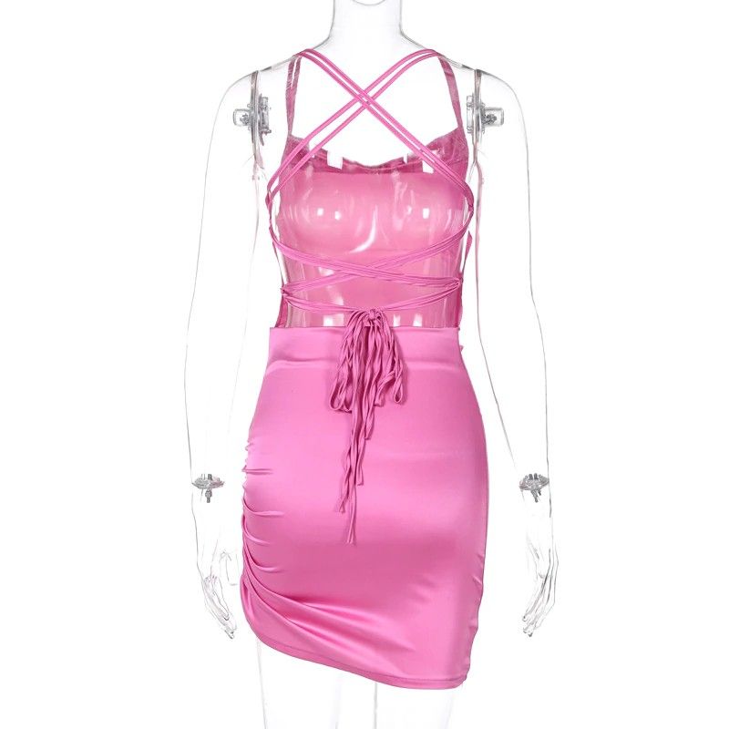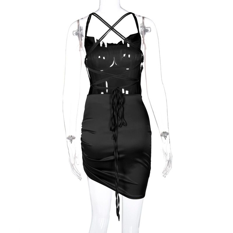 Dulzura Satijn Vrouwen Strap Mini Jurk Ruches Lace Up Cross Bandage Backless Bodycon Sexy Party Elegante Laatste Club Kerst Slim