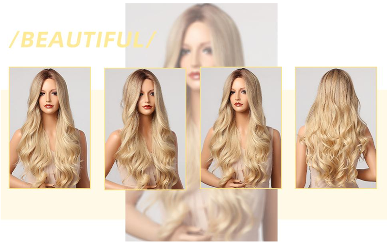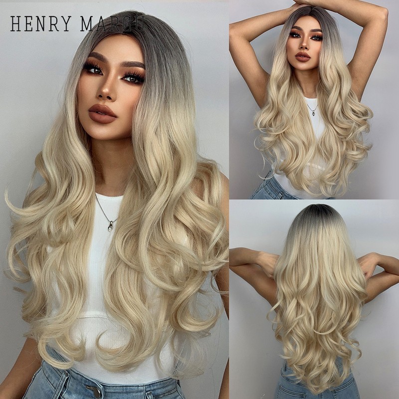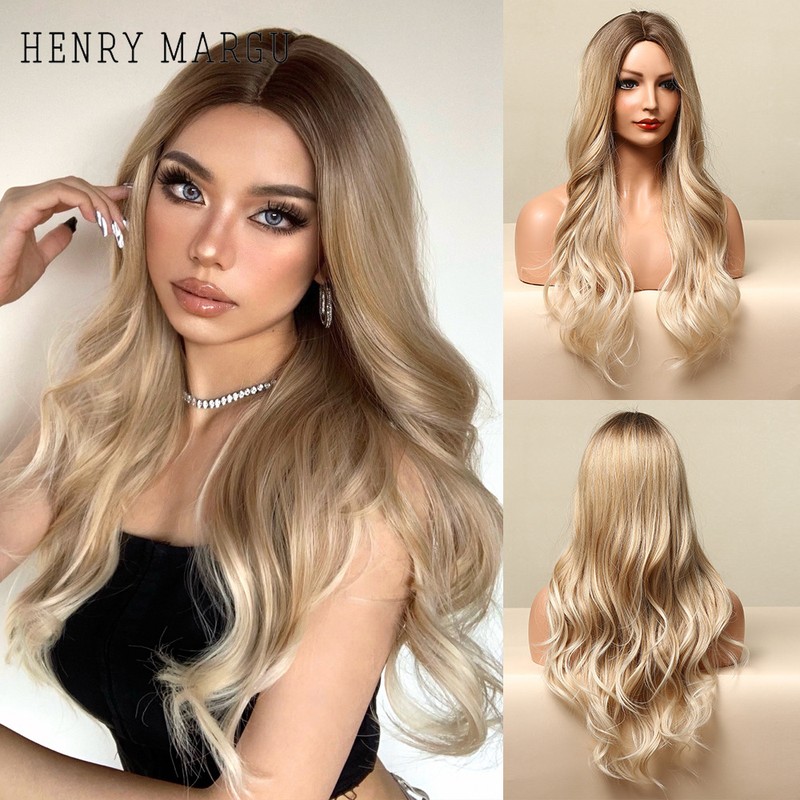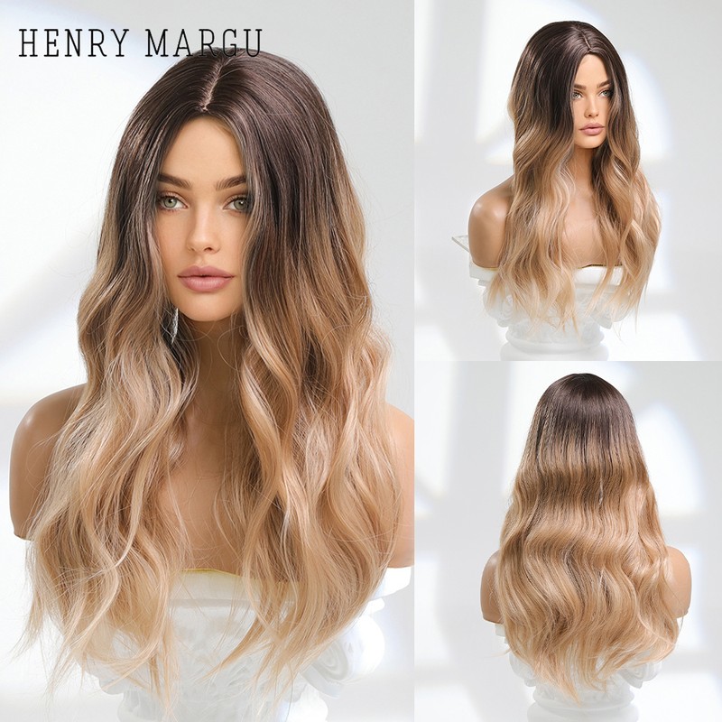 HENRY MARGU Ombre Bruin Gouden Blonde Pruiken Lang Golvend Middendeel Kostuum Cosplay Partij Synthetische Pruik voor Vrouwen Hittebestendigheid