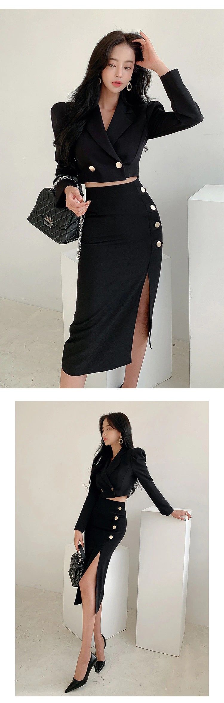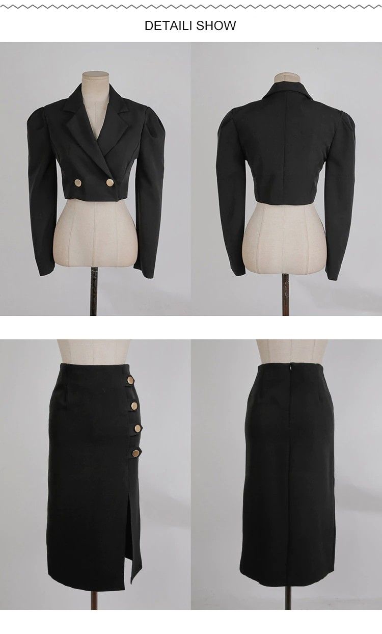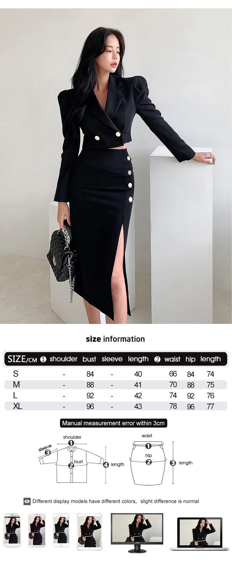 Nieuwe Collectie Mode Lente Zwart Set Vrouwen Ol Professionele Temperament Korte Pak En Split Midi Kokerrok Effen Rok Verleden