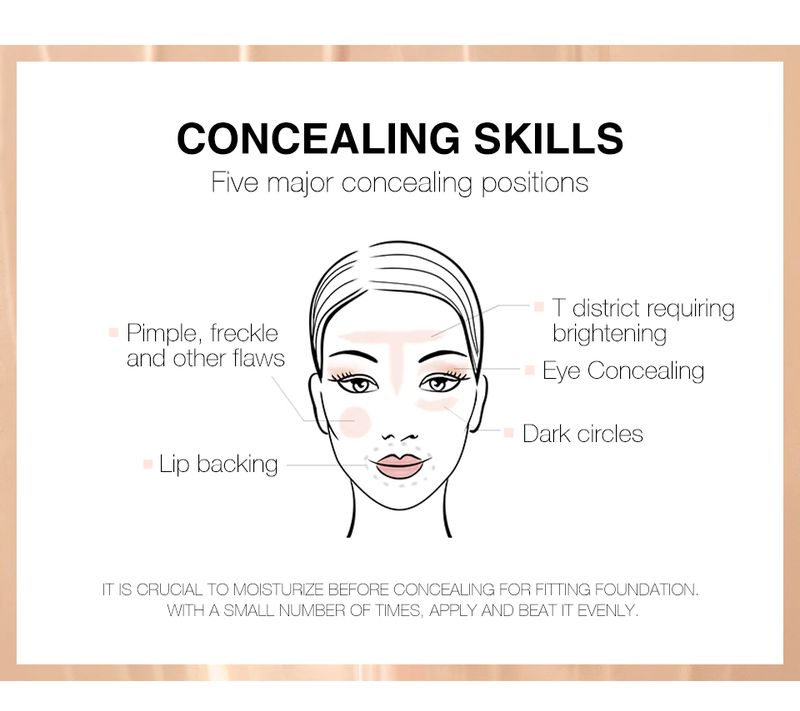Verhullende Vaardigheden: Vijf grote verhullende posities Puistje, sproet en andere gebreken Lip backing T district die verhelderende Donkere kringen Het is cruciaal hydrateren voordat verhullende voor montage foundation. Met een klein aantal keer, toepassen en beat het gelijkmatig.