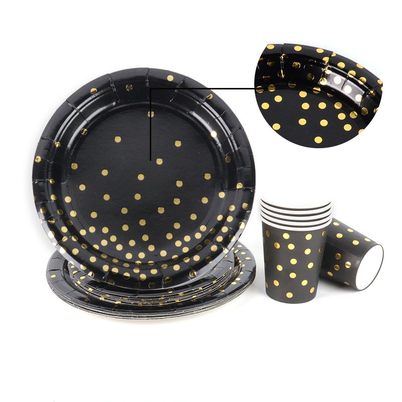 86pcs zwart Servies set D inclusief: 20pcs 7inch platen + 20 stuks kopjes + 25 stuks stro + 1set banner + 2pack 10pcs servetten