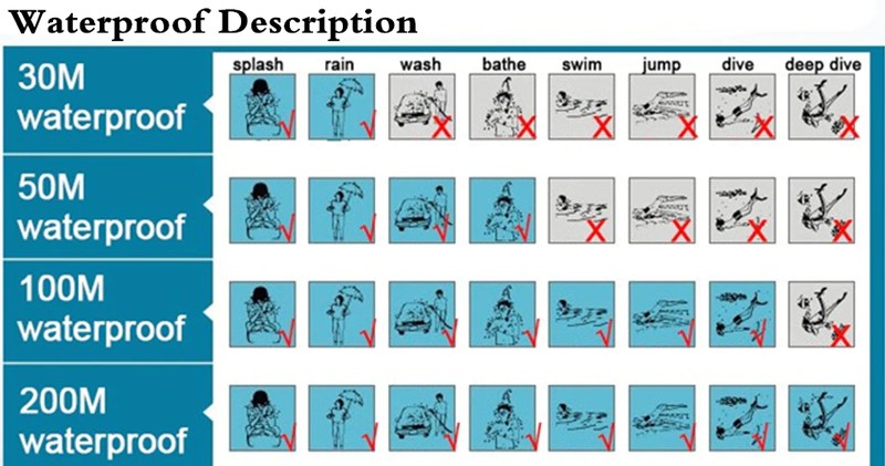 "Water Weerstaan" is Waterdicht case 30 M: leven waterdicht, zweet, kleine regendruppels niet bang, maar niet flush,bubble water, baden, zwemmen, duiken, etc.