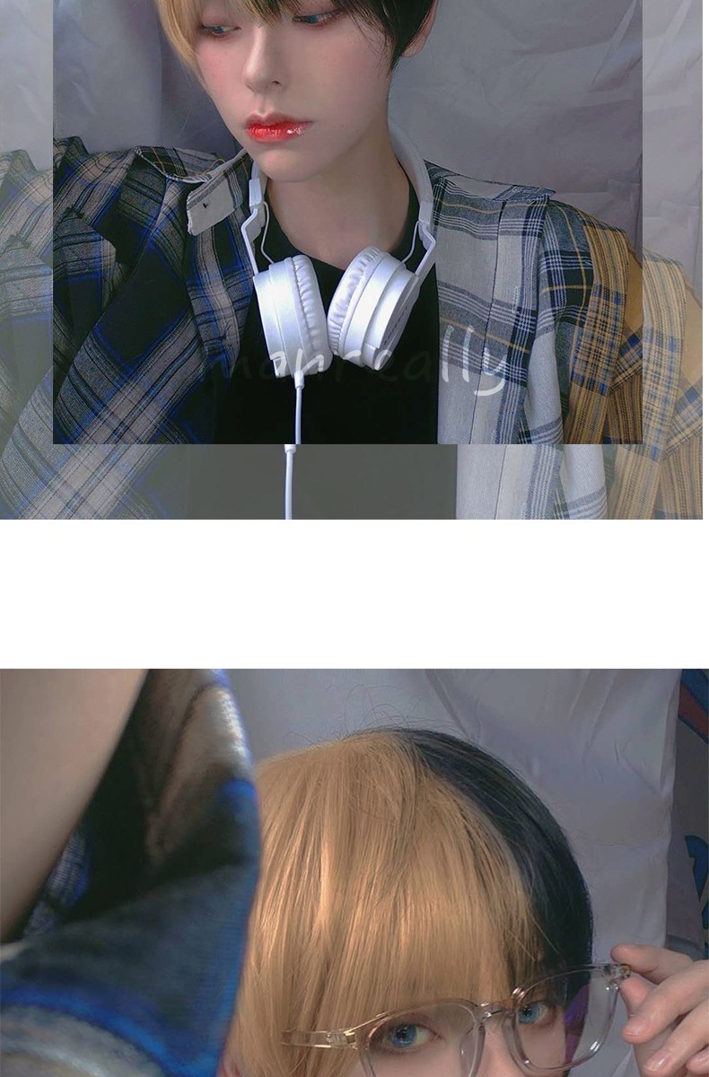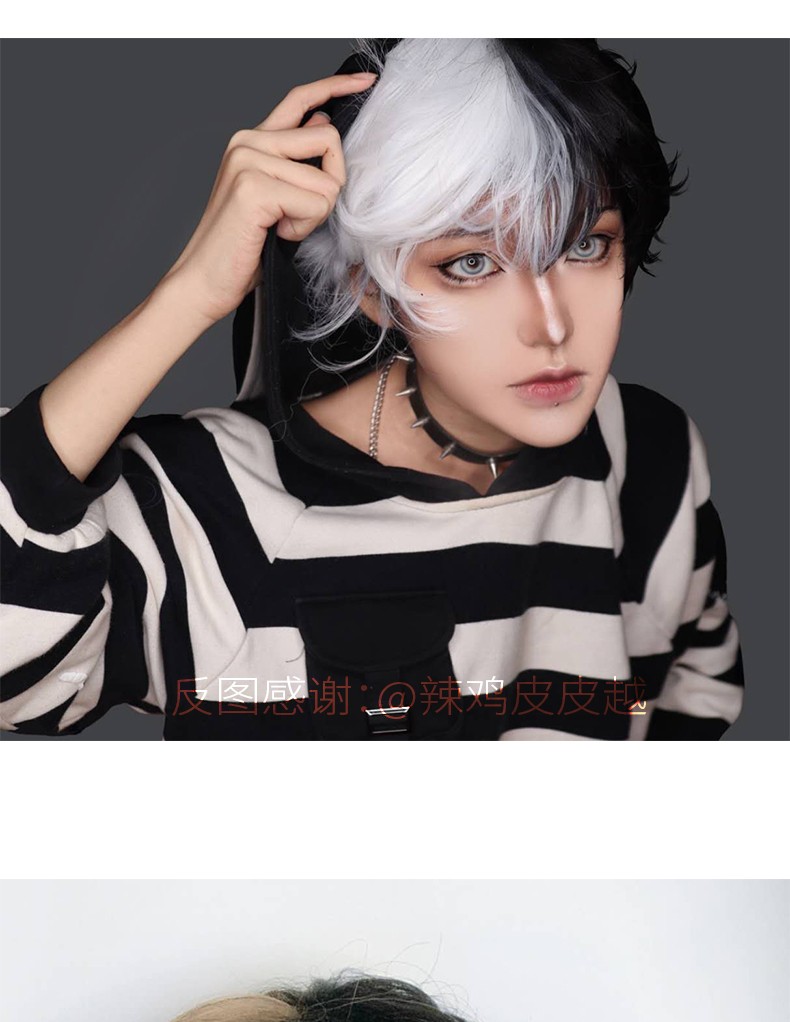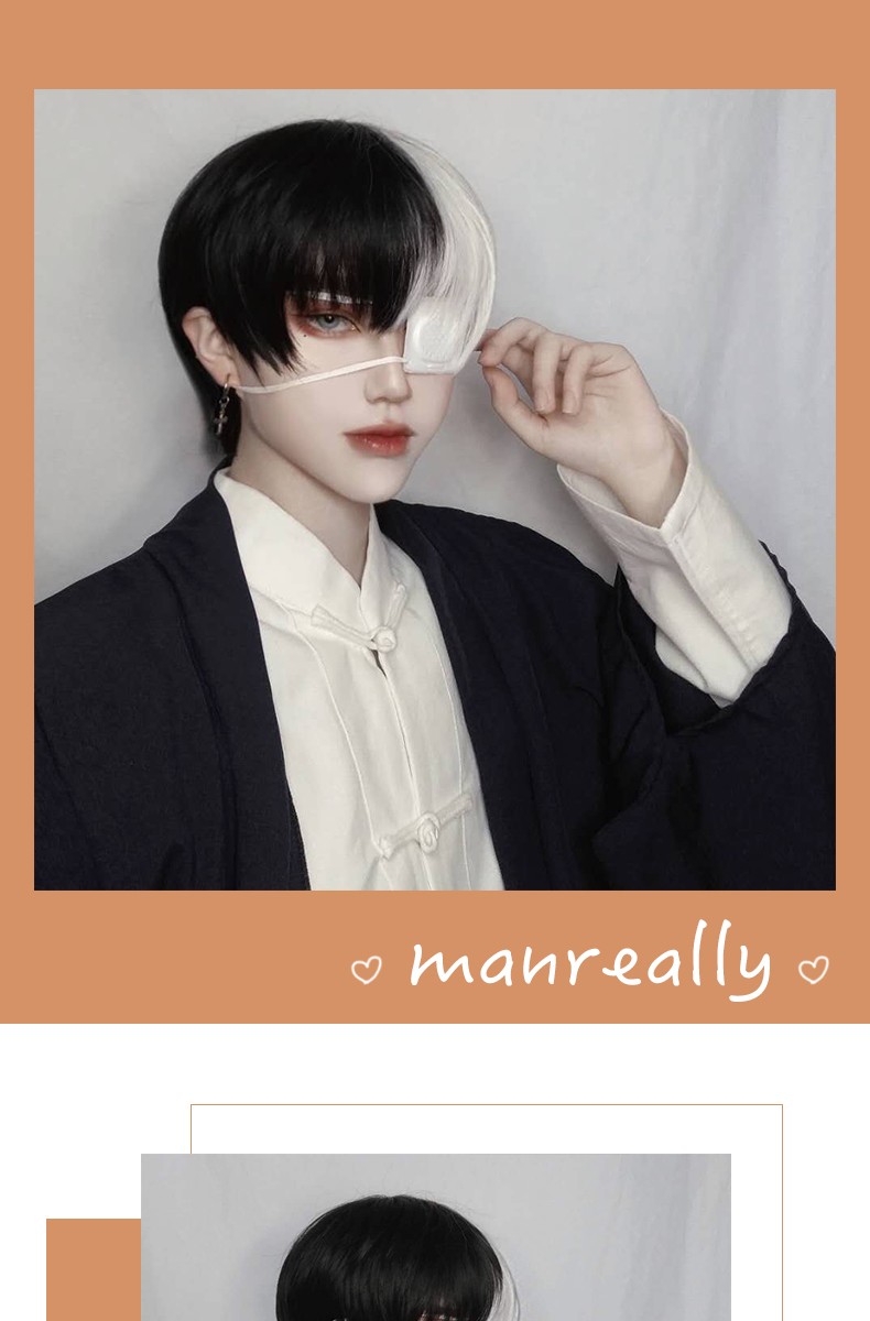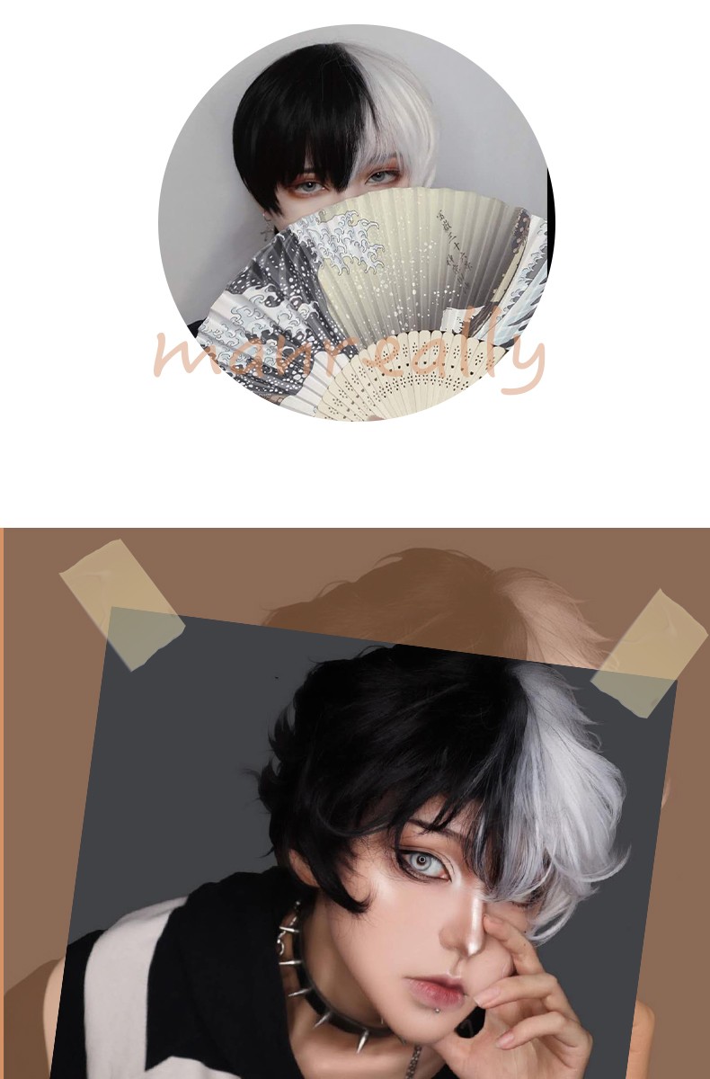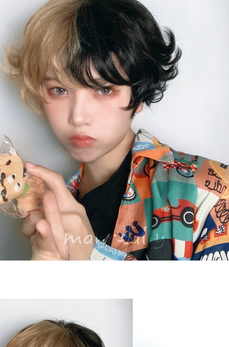 Kort Krullend Mannelijke Pruik Zwart Wit Geel Half Cosplay Anime Kostuum Halloween Pruiken Synthetisch Haar Met Pony Voor Mannen Jongen Vrouwen