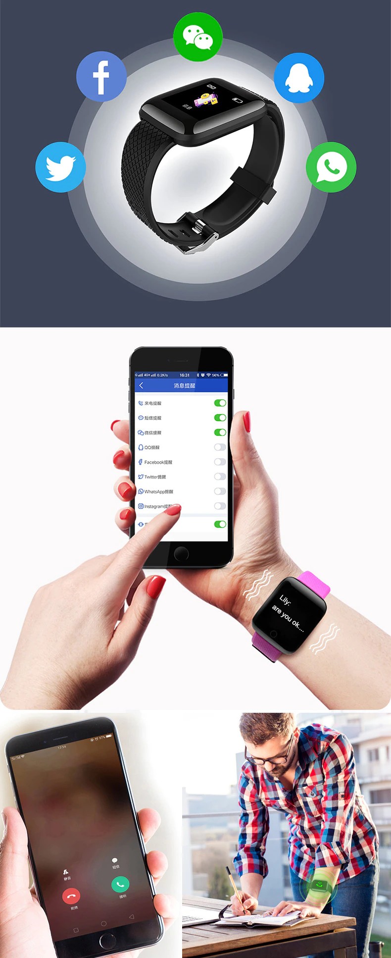 Software functies (tijd display, stap, calorie, afstand, sport modus, hand-op heldere scherm, slaap monitoring, atletiekbaan; oproep herinnering, bericht herinnering; sedentaire herinnering; alarm herinnering