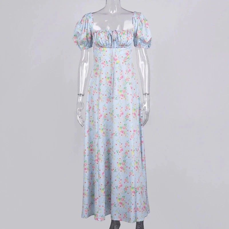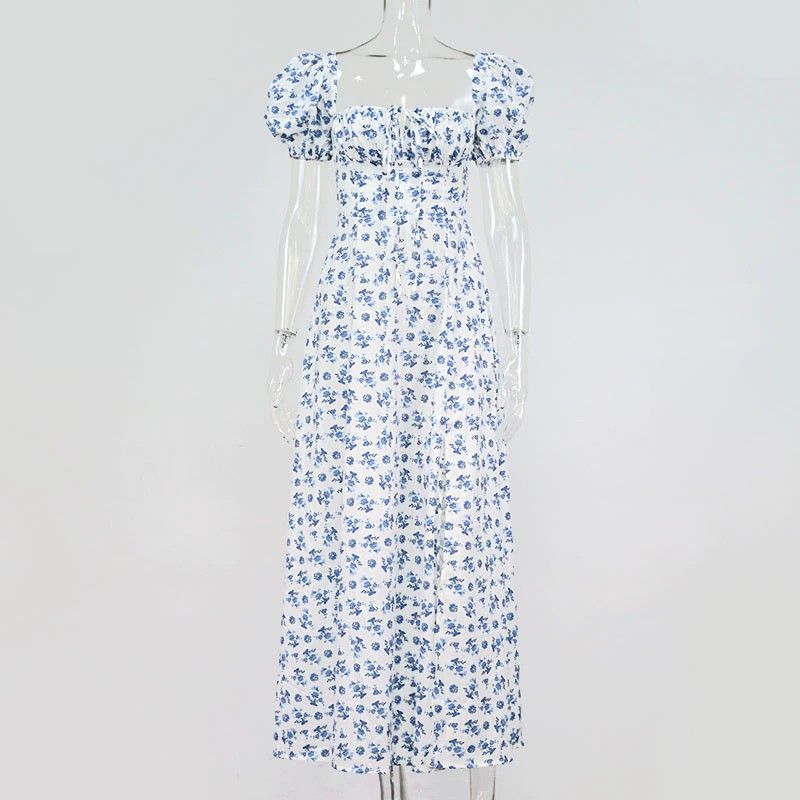 Zomer Jurk Vrouwen Korte Puff Mouwen Flroal Gedrukt Ruches Party Hoge Split Lange Maxi Jurken Trekkoord Sexy Vestidos Zonnejurk