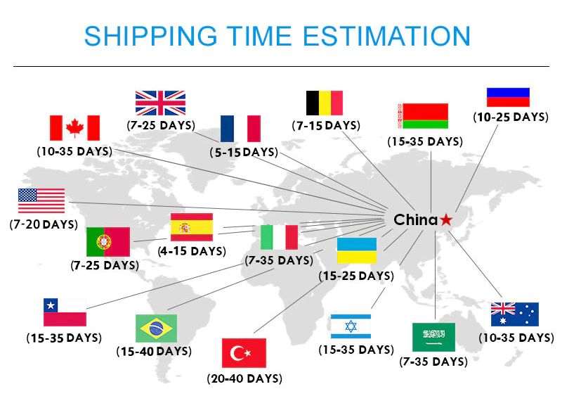 2. Wij verzenden al onze artikelen wereldwijd op de door u gekozen verzendwijze of op een snellere manier. Nadat we uw artikelen hebben verzonden, heeft het in het algemeen ongeveer 15-60 dagen (min of meer) naar uw land nodig. Het kan afhangen van de lokale douane-inklaring die we kunnen regelen.