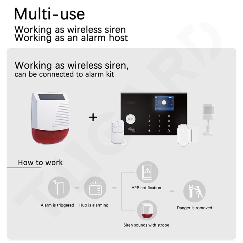 Multi-gebruik: Werken als draadloze sirene, kan worden aangesloten op alarm kit