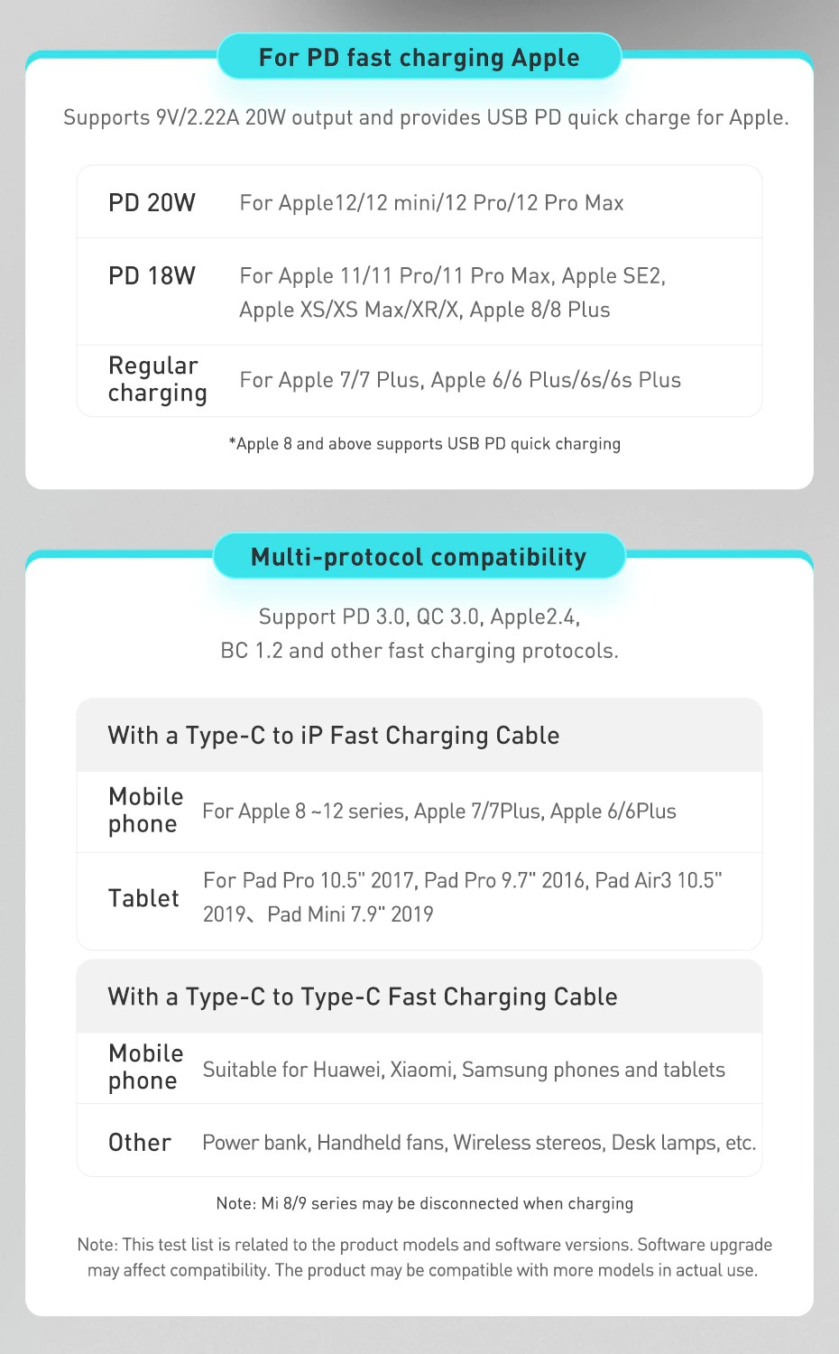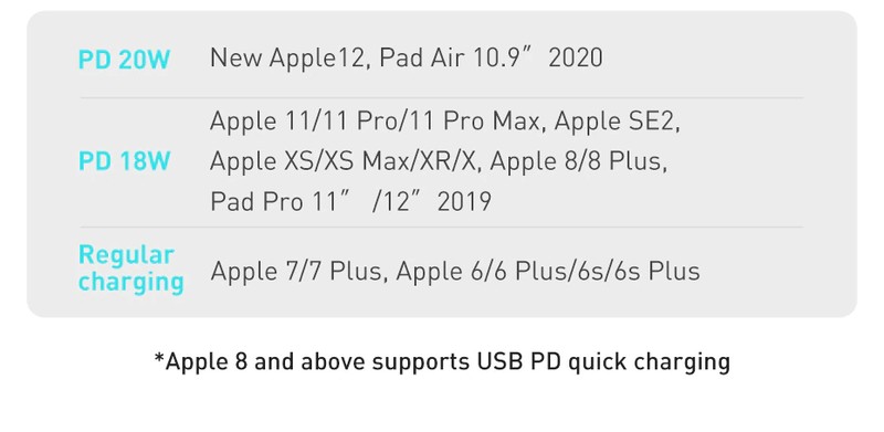 Alle Apple8 en bovenstaande modellen ondersteuning PD snel opladen, die versnelt oplaadtijd door 3 keer in vergelijking met 5V/1A laders.