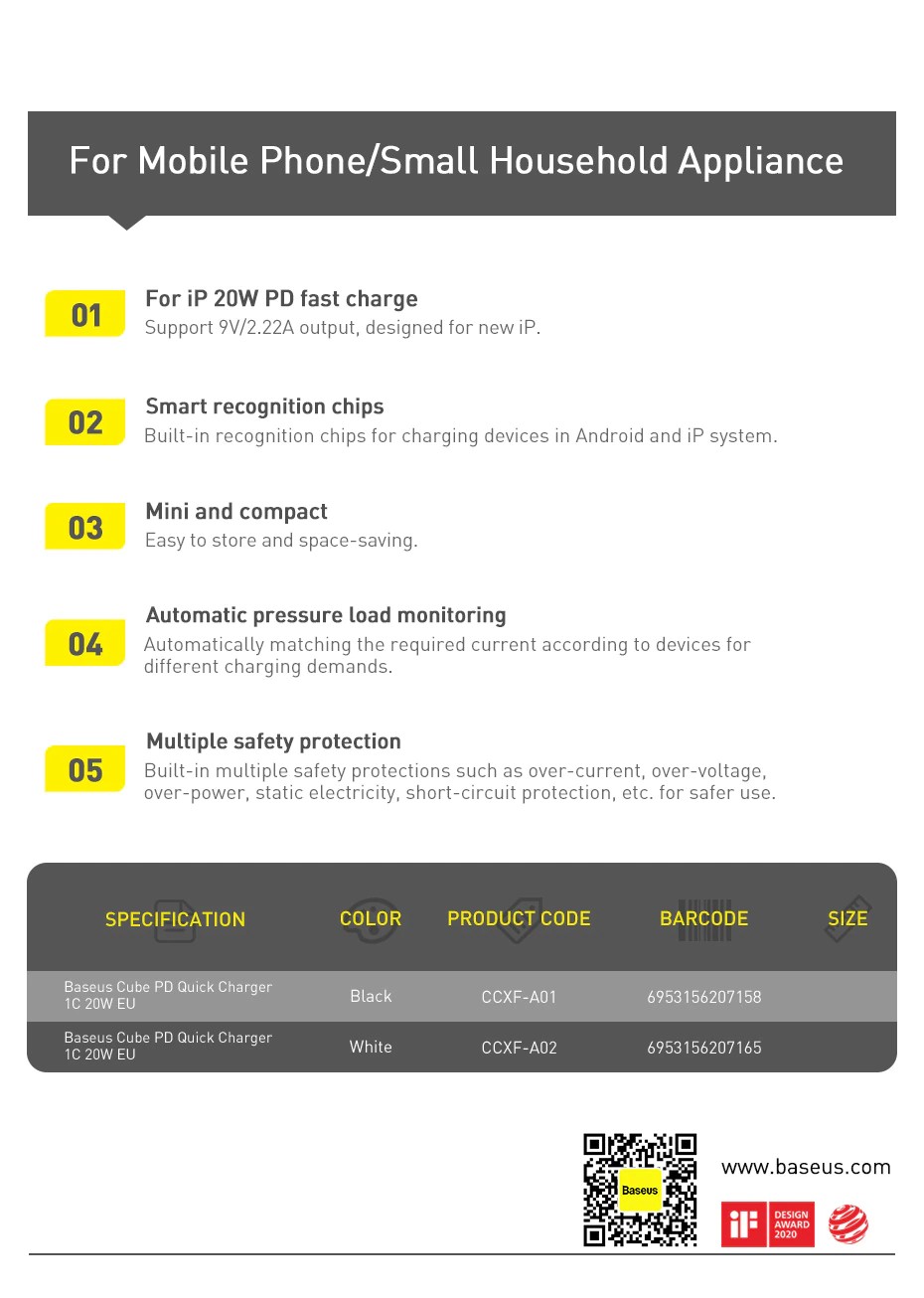 Ondersteunt 9V/2.22A 20W output en biedt USB PD quick charge voor Apple.
