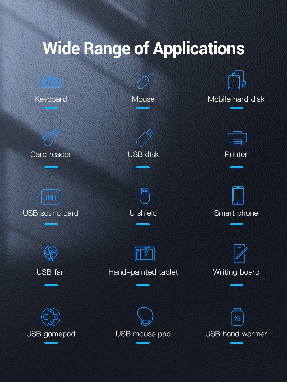 Deze USB hub gelden toetsenbord, muis, mobiele harde schijf, kaartlezer, USB schijf, printer,USB geluidskaart, U shield,smart telefoon, USB ventilator, handgeschilderde tablet, schrijfbord, USB gamepad,USB muismat, USB handwarmer, etc.