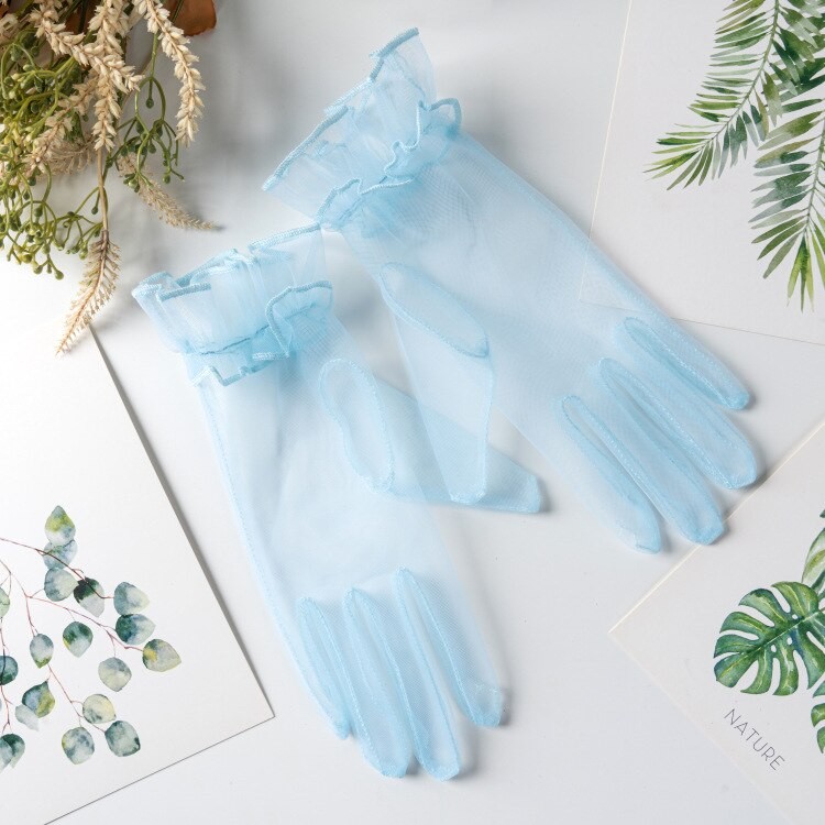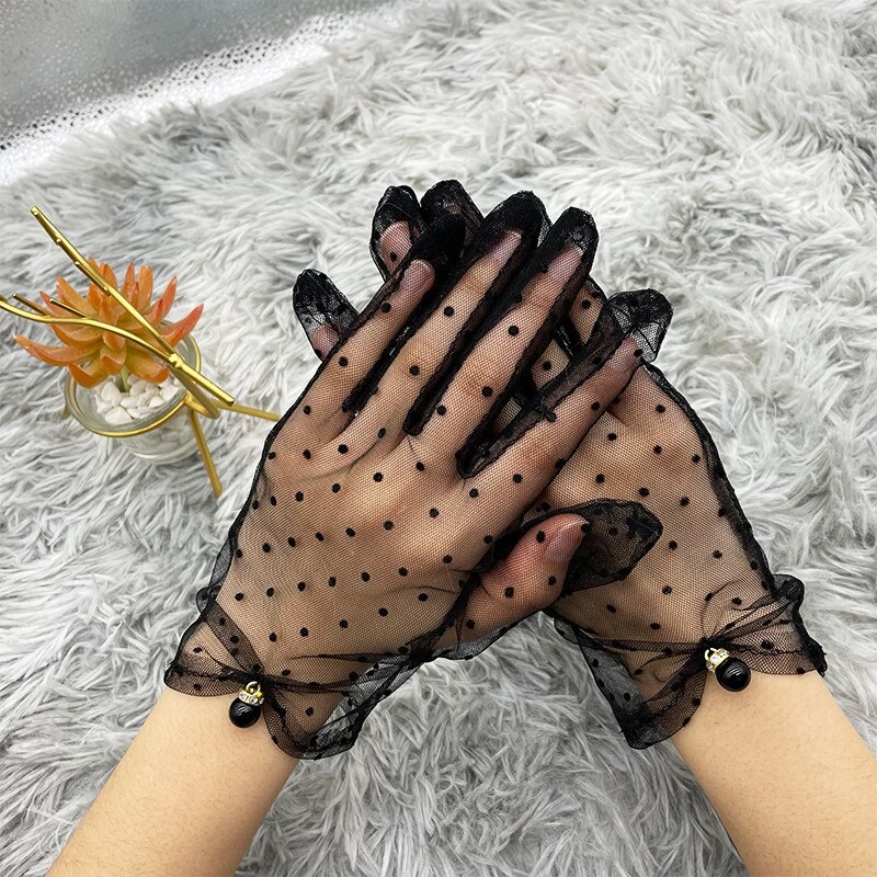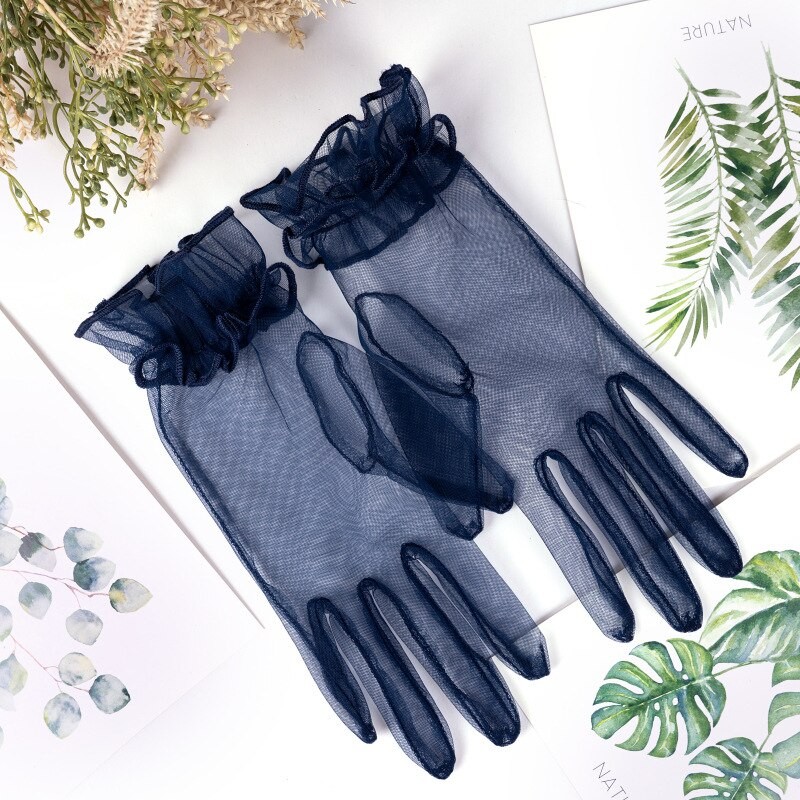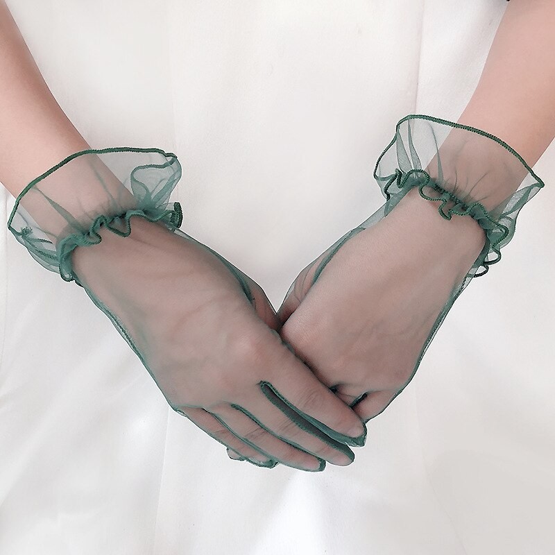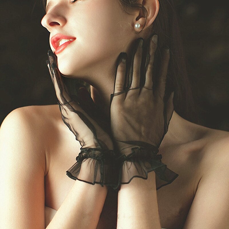 Vrouwen Handschoenen Kant Volledige Vinger Handschoenen Korte Tulle Bruids Stretchy Lotusblad Sheers Zwart Wanten Bruiloft Handschoenen