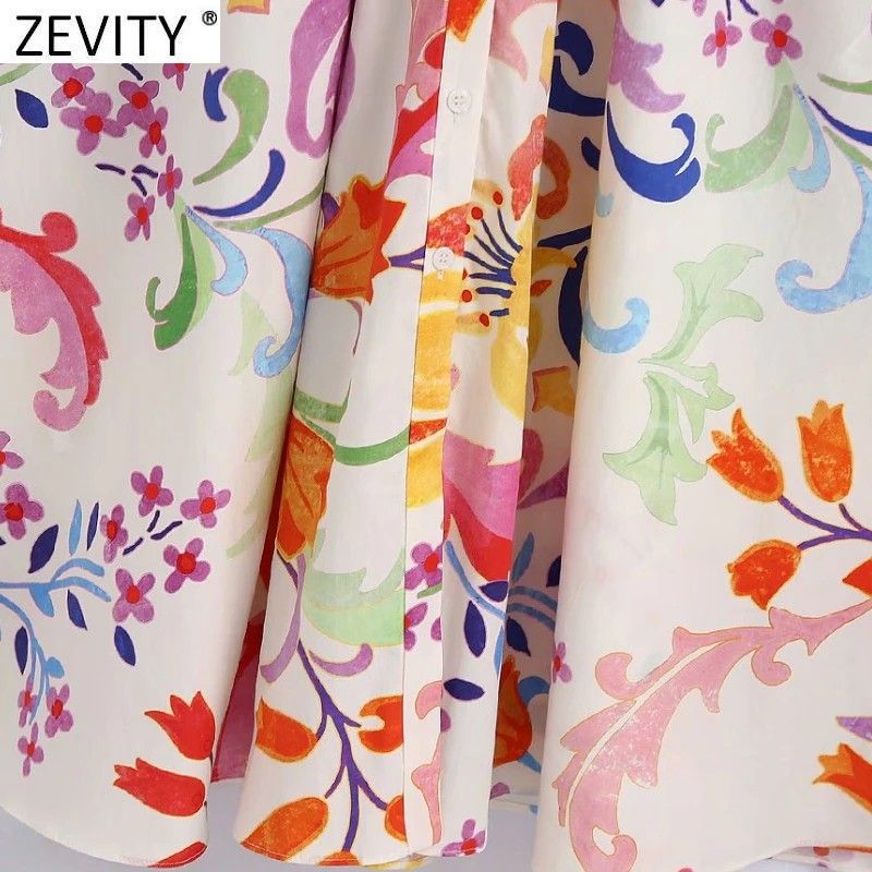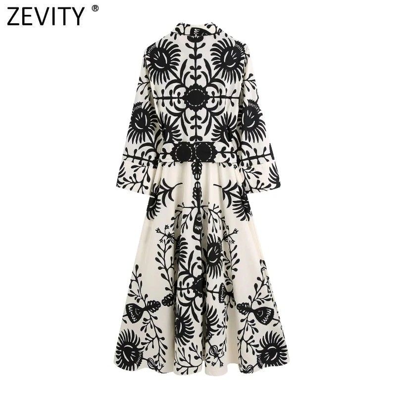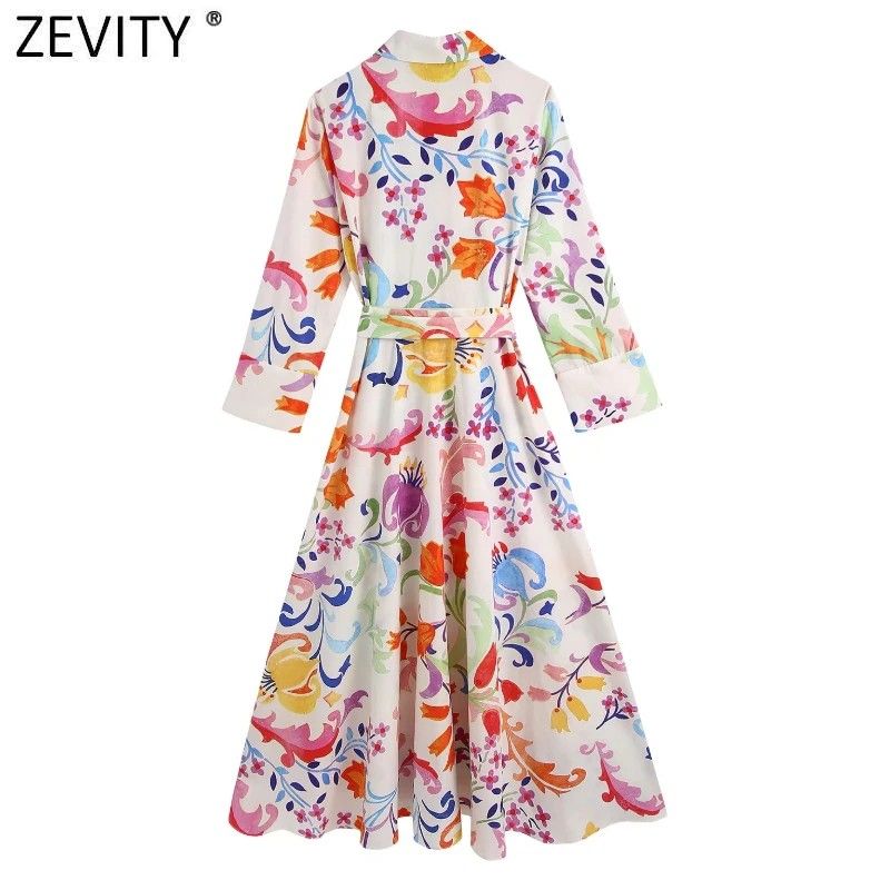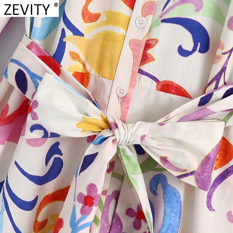 Zevity Vrouwen Vintage Totem Bloemenprint Boog Sjerpen Midi Shirt Jurk Vrouwelijke Chic Drie Kwart Mouw Casual Slim Vestidos Ds8361