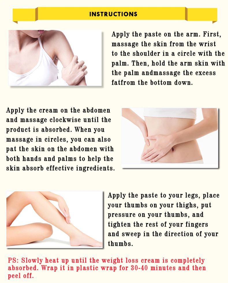 طريقة الاستعمال:تطبيق كمية مناسبة من كريم التخسيس إلى المنطقة ليتم تدليك. يسخن ببطء حتى يتم امتصاص كريم فقدان الوزن تماما. التفاف في التفاف البلاستيك لمدة 30-40 دقيقة ثم تقشر.