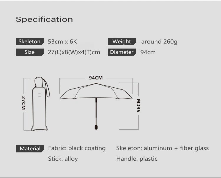 Este paraguas tiene un diseño de forma plana, para que sea portátil y ligero, y fácil de poner en su bolsa. El diseñador diseñó este paraguas ultraplano de acuerdo con las necesidades reales y la ergonomía, destacando la singularidad y la COMODIDAD DE ESTE paraguas.