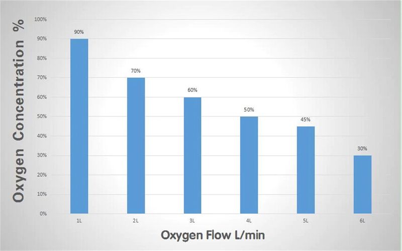 Concentração ajustável do oxigênio: forneça o fluxo contínuo 1-6 l/min ajustável, 30%-90%,(1 l: 90% 3 3 2 l: 50% 3 3 6 l: 30% 3 3)