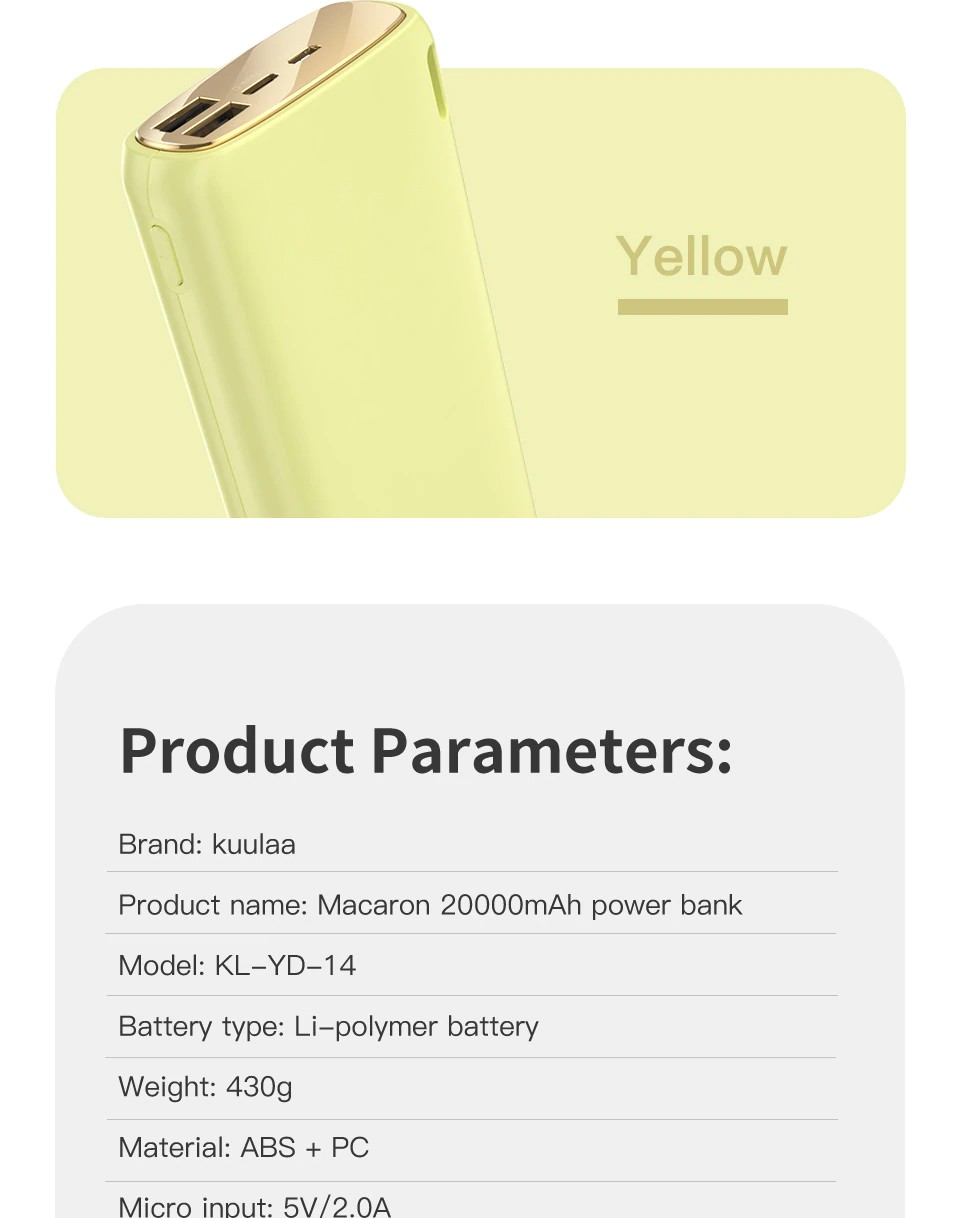 Battery capacity: 20000 mAh Size: 29.3*72.2*145.3mm