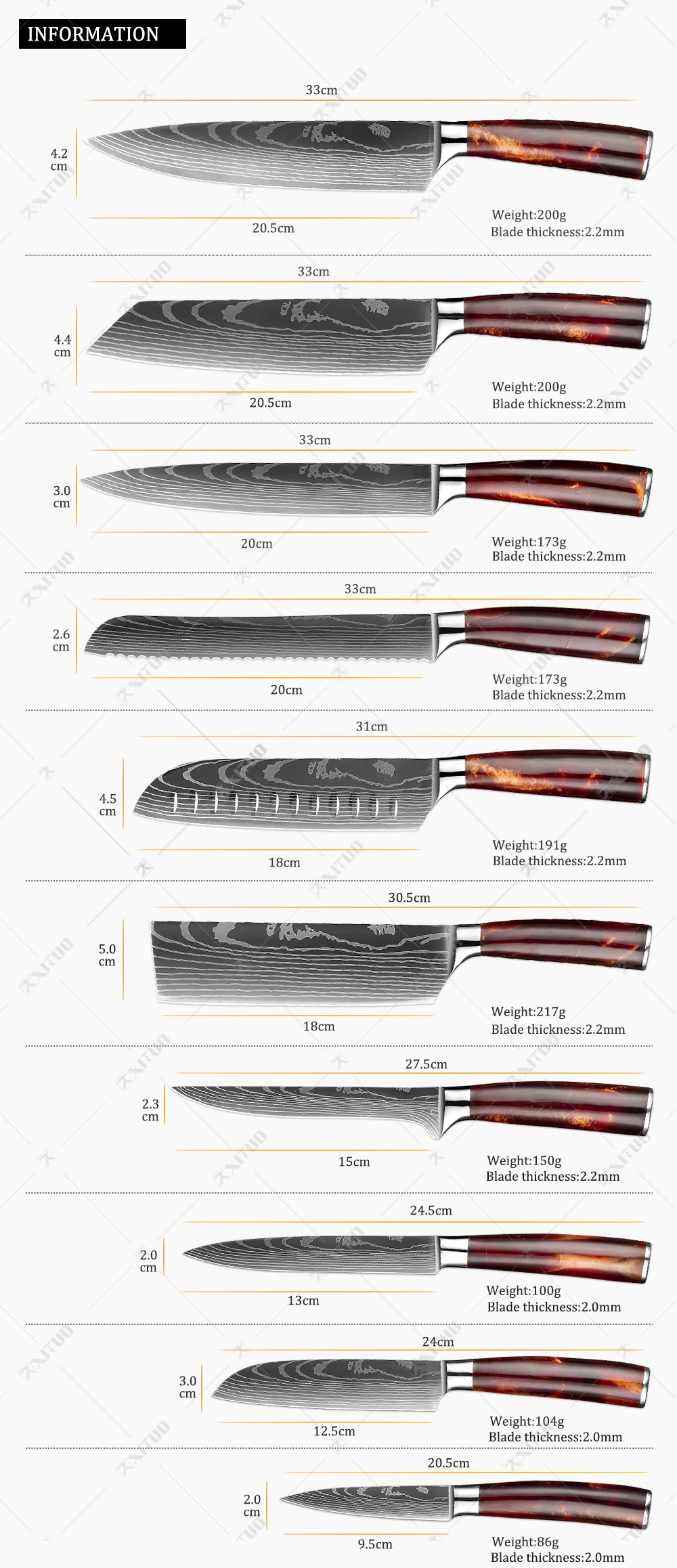 Dicas: a lâmina é de aço inoxidável, a superfície do padrão de damasco laser, muito bonito, bom acabamento, navalha afiada, manter sua cozinha longe da faca sem corte, e desfrutar de sua vida na cozinha!
