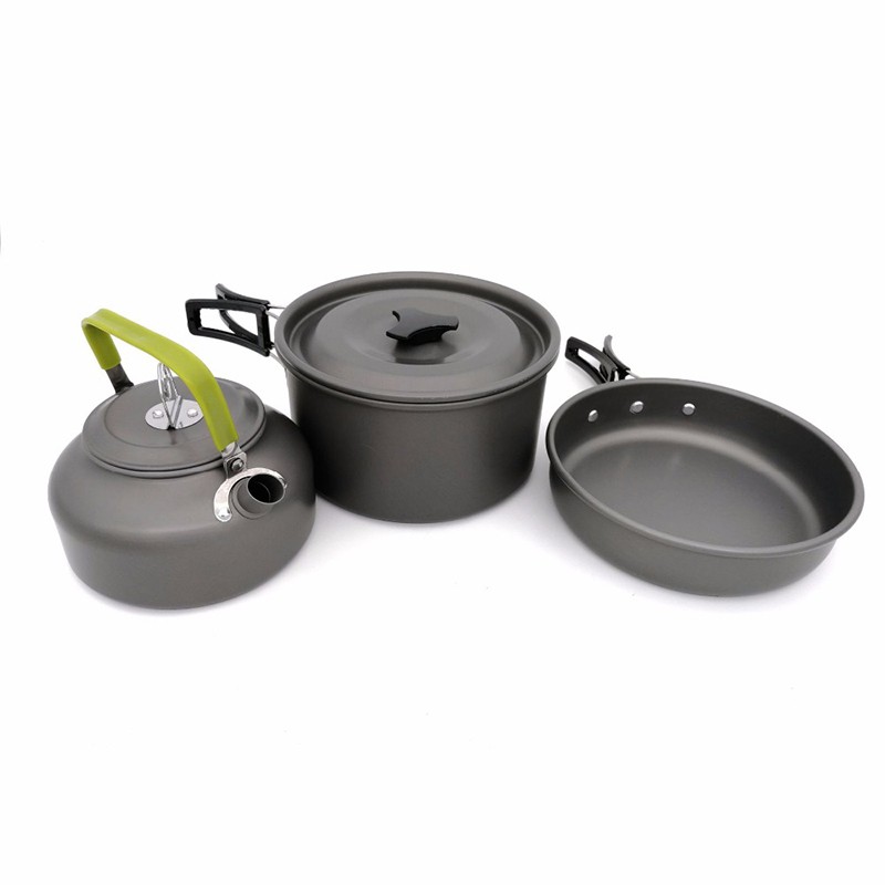 1. panela de cozimento * 1 2. frigideira * 1 3. chaleira * 1 4. caneca de aço inoxidável * 2 5. colher garfo faca conjunto * 1 6. saco líquido * 1