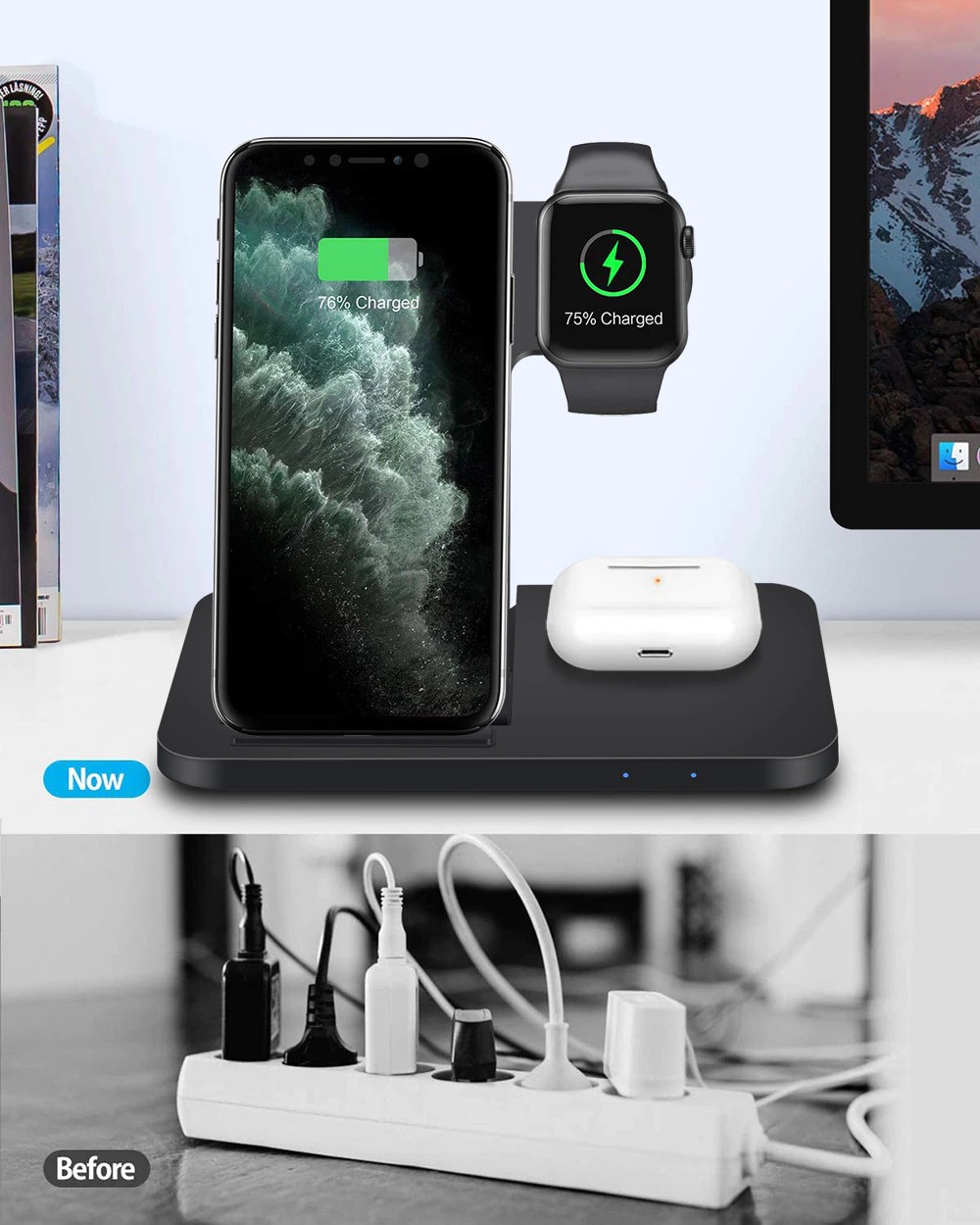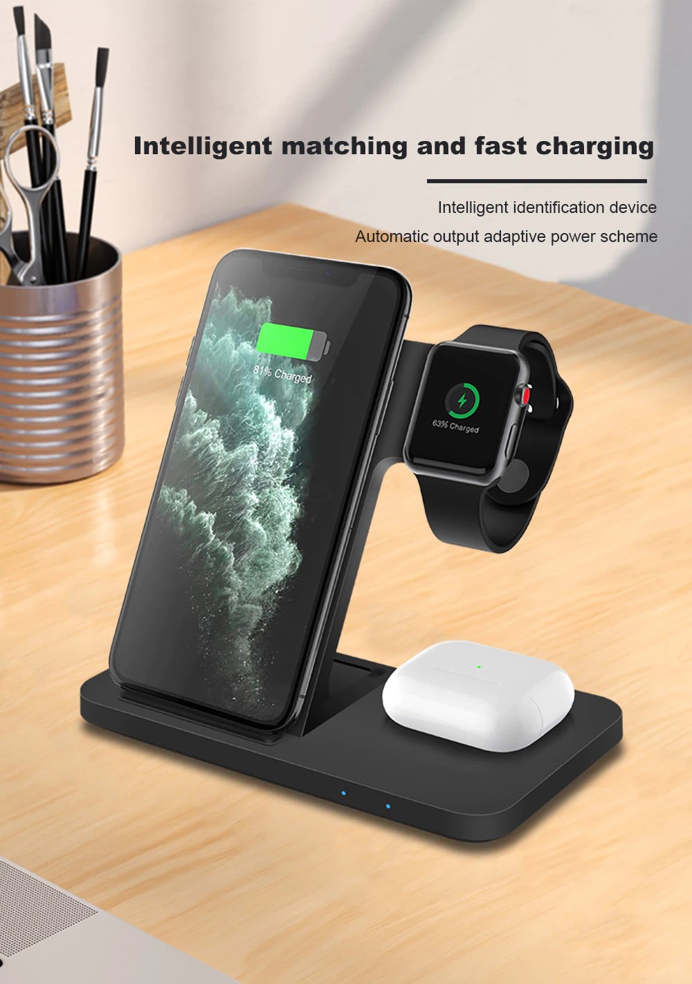 1. este 3-em-1 carregador sem fio suporta o telefone inteligente e apto para apple watch 2/3/4/5/6/se. Além disso, ele pode carregar um telefone, um relógio inteligente, um fone de ouvido ao mesmo tempo para economizar seu tempo.