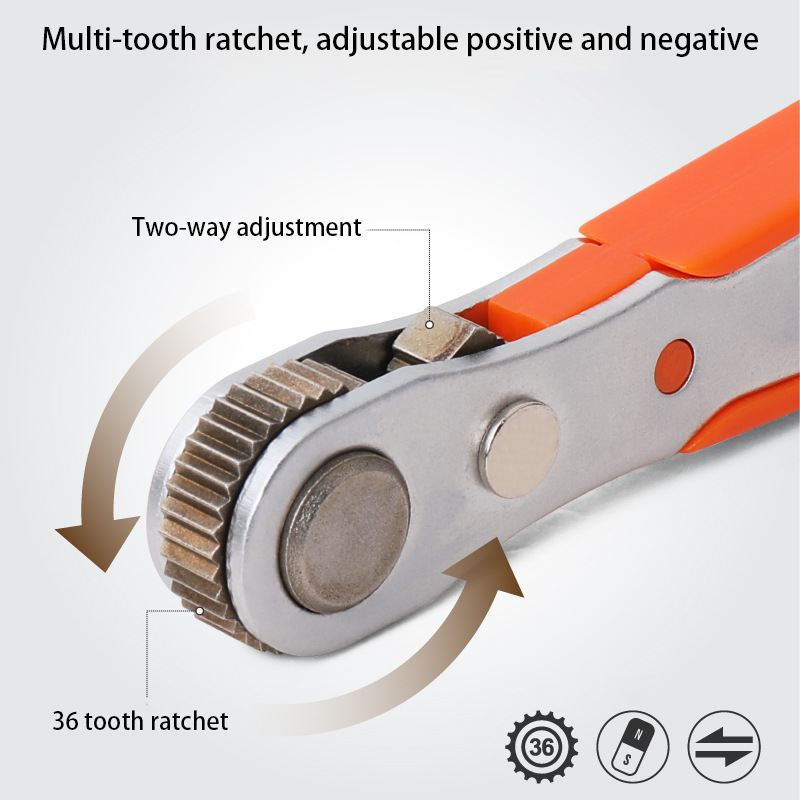 O design de cabeça dupla é adequado para a maioria dos mandris, e a função de catraca permite que você trabalhe mais rápido.