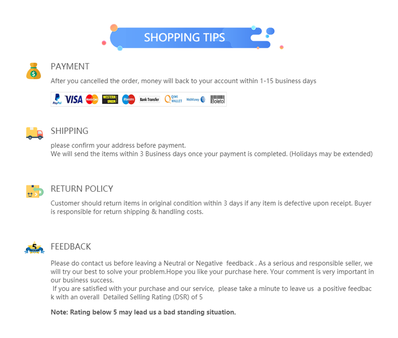 3. se você encontrar quaisquer problemas ao receber ou usar, nós fornecemos 100% de garantia pós-venda! Por favor entre em contato conosco em primeiro lugar imediatamente antes de deixar feedback, obrigado pela sua compreensão.
