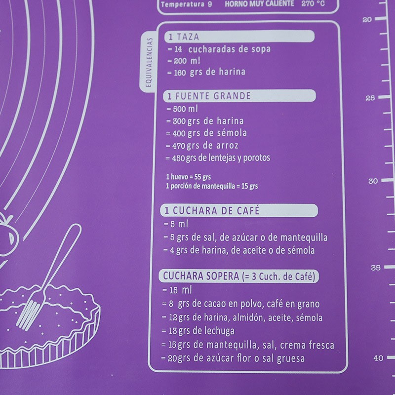 Este tapete de cozimento tem uma escala em centímetros e outra em polegadas. Fazendo os doces neste tapete, você vai economizar muito trabalho e se divertir.