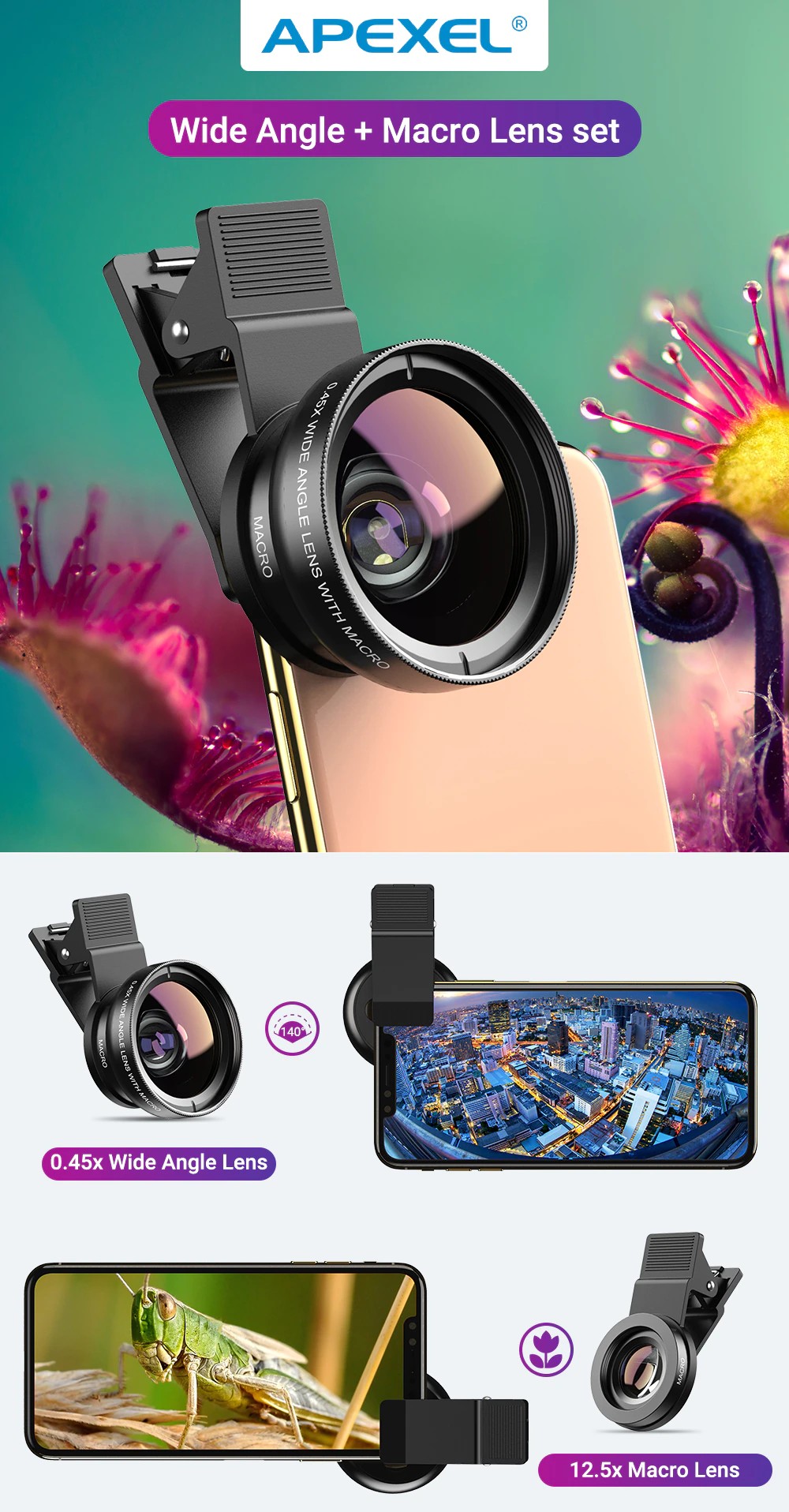 Apexel lente do telefone kit 0.45x super grande angular & 12.5x super macro lente da câmera hd para iphone 6s/6s mais 7 xiaomi samsung s8
