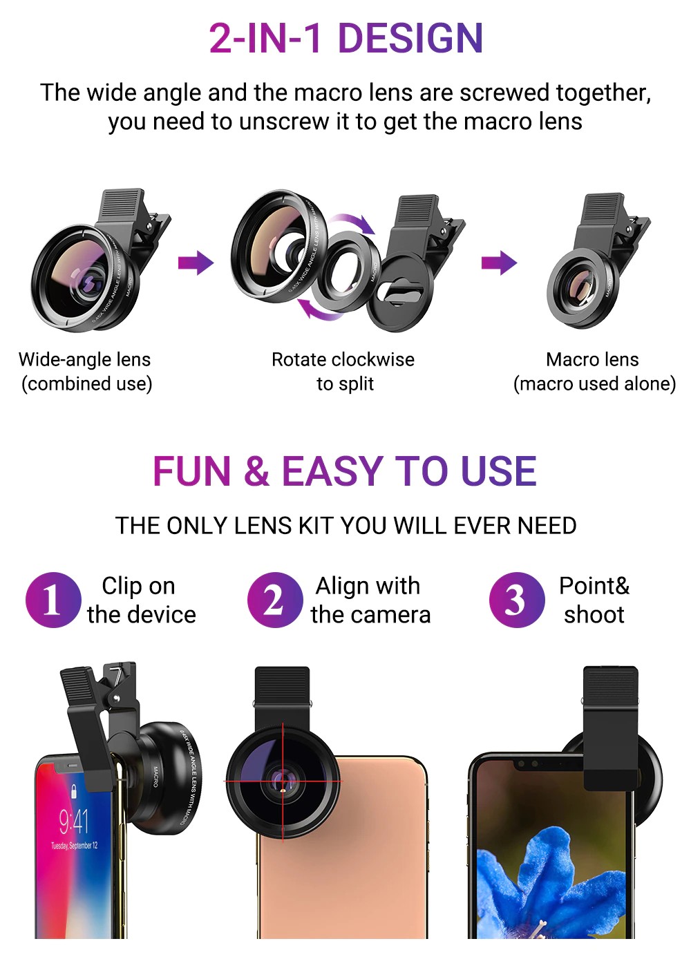 Estas lentes clip-on funcionam com qualquer telefone com uma lente de câmera de 13mm ou menor.