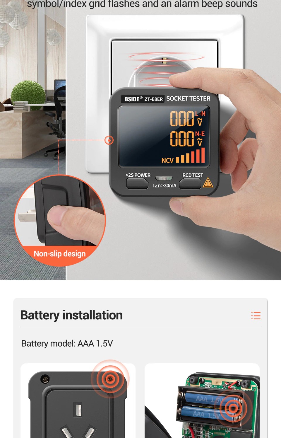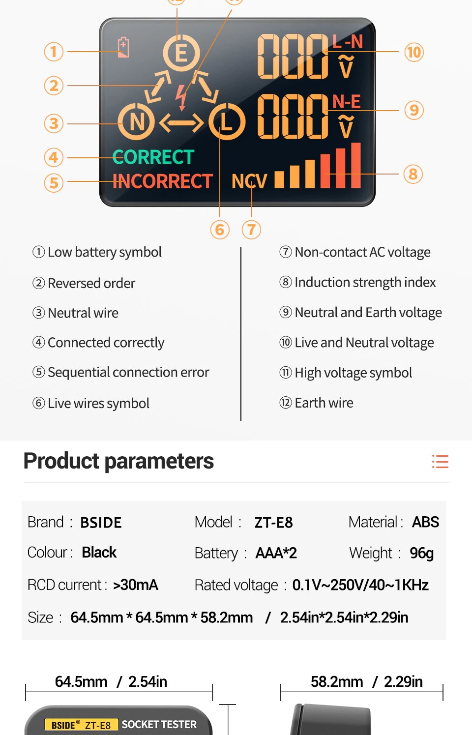 Bside ZT-E8 multi-purpose smart socket tester são usados principalmente para detectar polarit de socker de energia e segurança de interruptor de vazamento. (teste rcd/gfci)